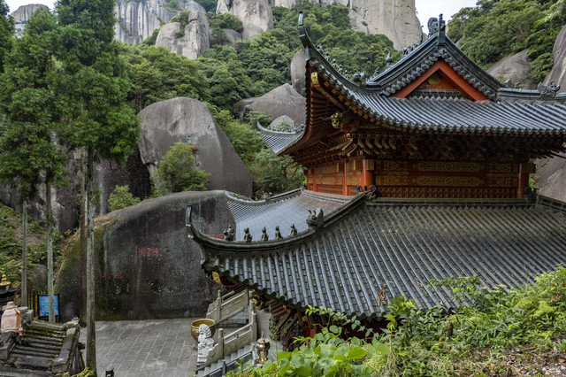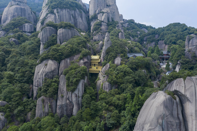 一片瓦:金殿夹持两峰之中,背靠太姥山主峰九鲤朝天峰,左搭升天石,右接莲花峰,两峰拱持金殿。名山起名殿,奇景添奇观。