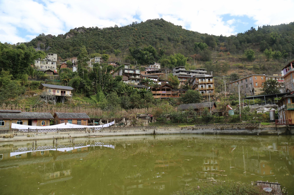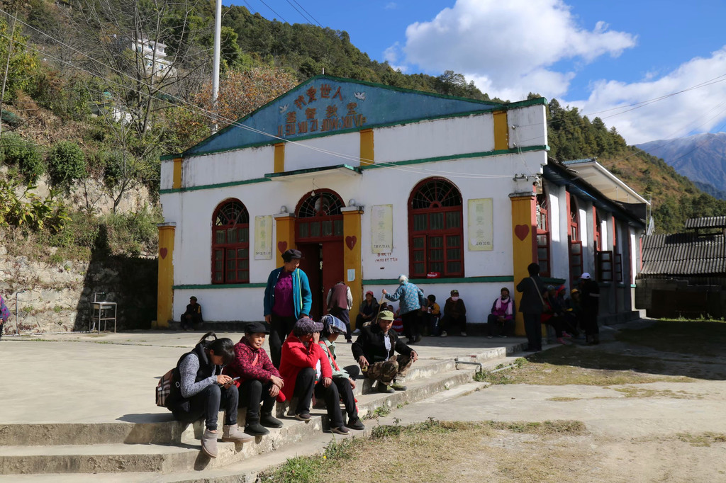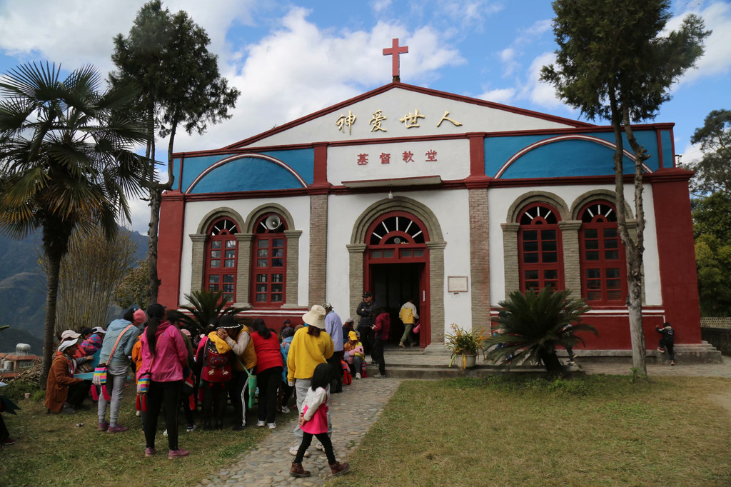 村中有一个基督教堂,是怒江流域最大的教堂,青色砖墙,红漆木窗,白铁皮屋顶,相当纯粹。教堂边有一湾碧水,犹如一面镜子,映照出蓝天白云和教堂。教堂前围着一群人,有的席地而坐,有的虔诚地站着,聚精会神地吟唱经文,为这个大山环抱的村落增添了不少神秘的感觉。