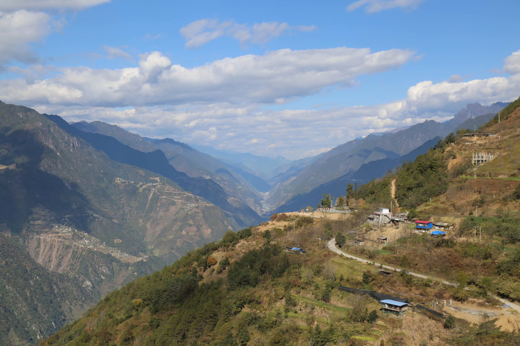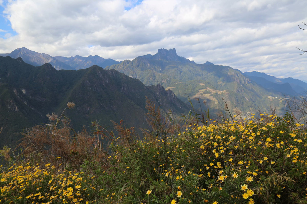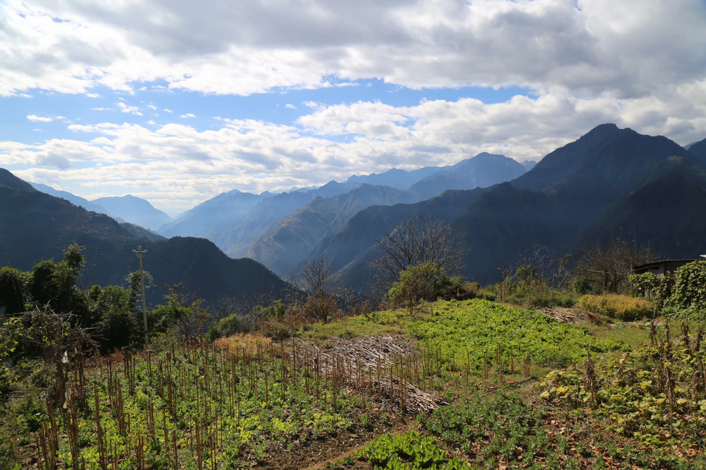 下午3点多钟告别知子罗,沿着山路一路下坡,车行不到10分钟,就到达了位于碧罗雪山半山腰的老姆登村。这是一个怒族村寨,与皇冠山隔江相望。入住农家酒店山居格嘎客栈后,放下行李,徒步两个观景台,老姆登是观赏皇冠山的绝佳选择。大自然鬼斧神工,皇冠山宛如高黎贡山的皇冠,峰顶经常云雾缭绕,雄奇壮观。