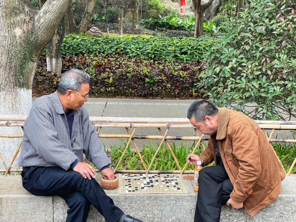看看这里的景象,好不热闹。好几个老大爷在这里下围棋,而且还看到一个大爷和孩子下围棋。不得不说,现在的孩子真的都太聪明了。