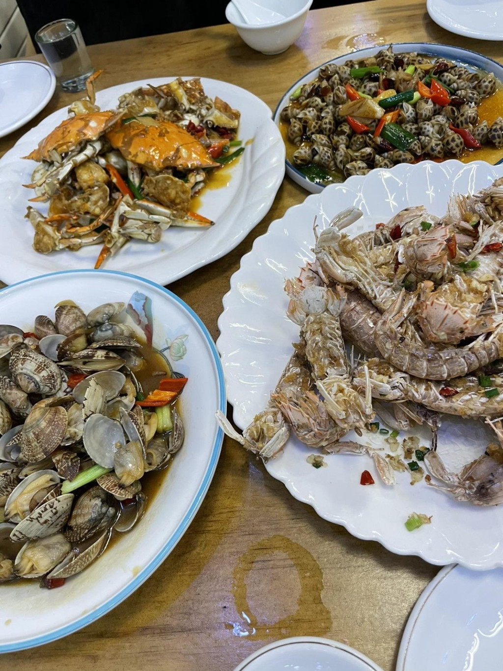 我们的午餐就是在海鲜加工店吃的,买了皮皮虾,梭子蟹什么的。因为都是新鲜海鲜,价格也比较贵。另外,海鲜加工档铺也要收取一定费用,所以综合算下来价格比较高。