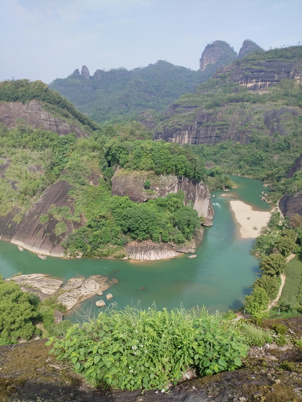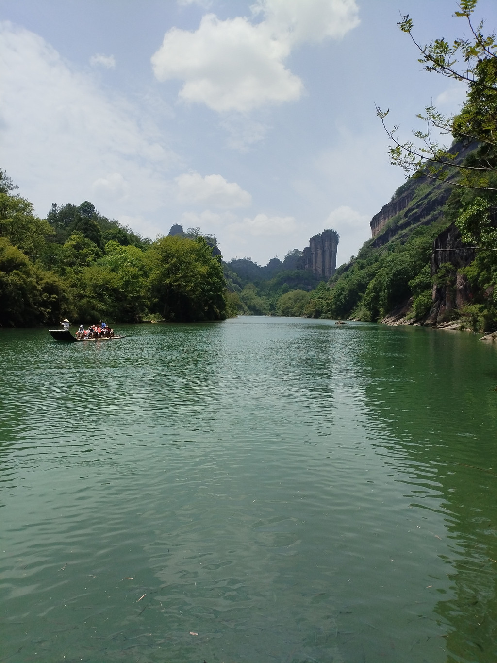 我们福建游的第一站就是武夷山。武夷山在福建省西北部,地处福建和江西交界处。武夷山是丹霞地貌,享有碧水丹山的美誉。碧水主要是指九曲溪,它蜿蜒曲折,似一根绿色绸带绕着一座又一座奇峰险岩,溪水上的竹筏载着游客顺流而下。碧水,竹筏,山崖,构成武夷山中一幅绝美的山水画。