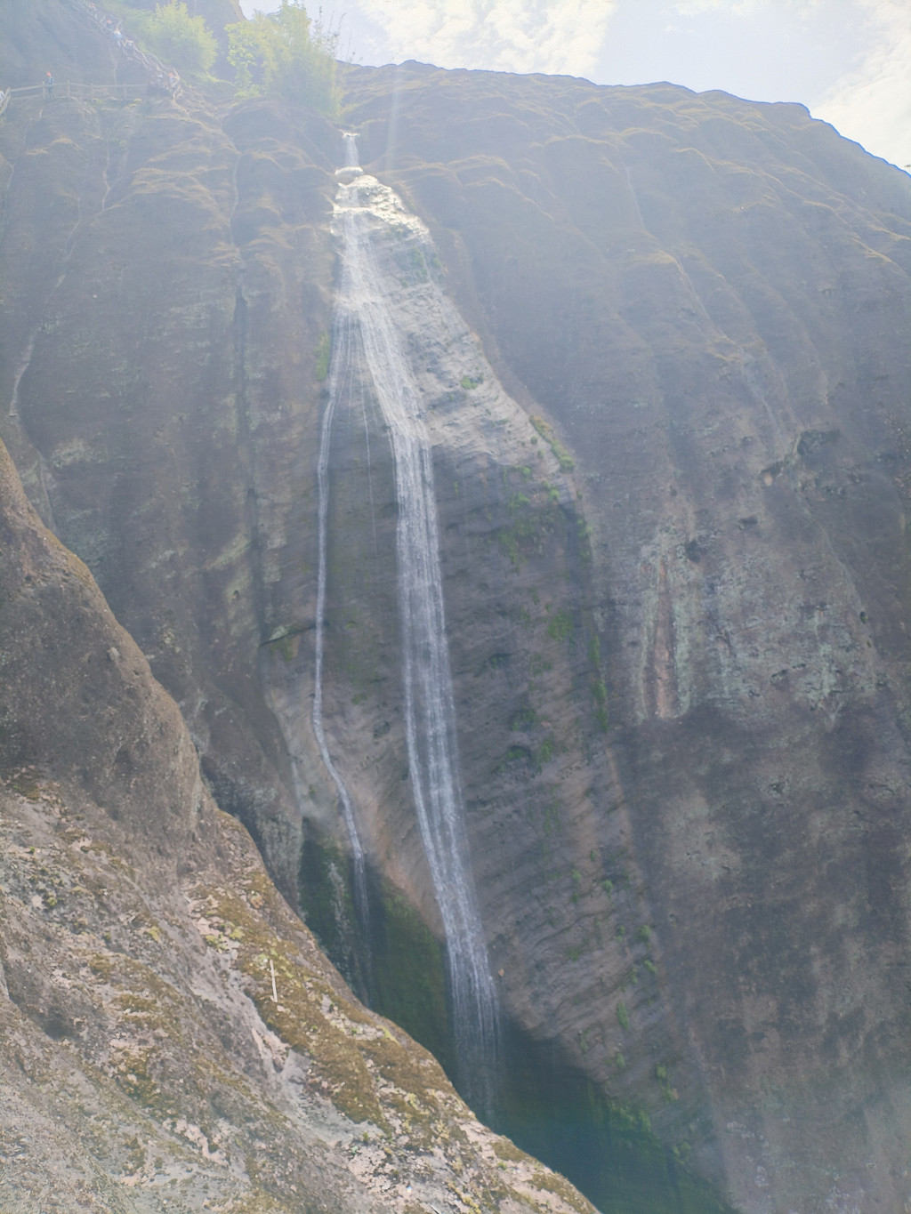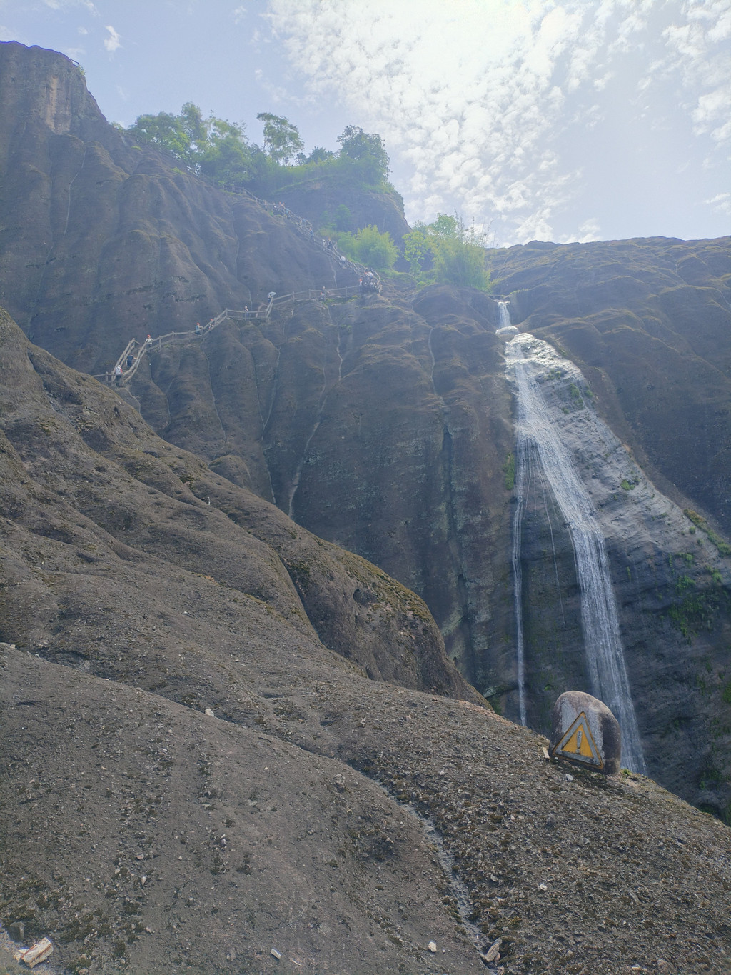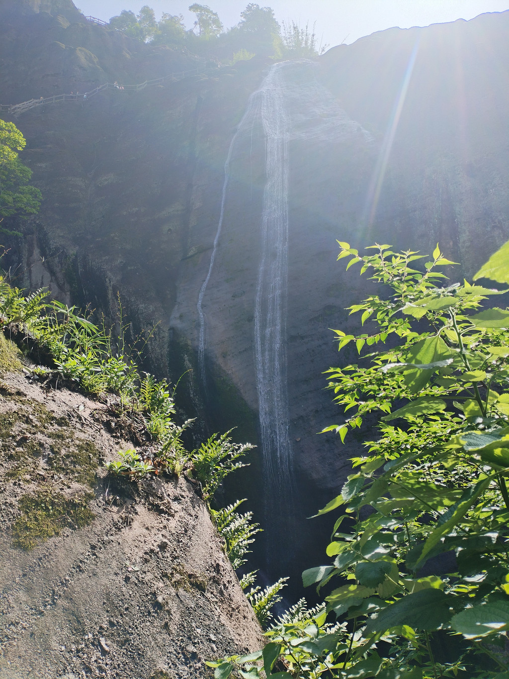景区很大,峡谷很深,天气又时阴时雨,阿李和旅游搭子只走了景区的小环线。我们看到了鹫峰山脉中如仙女裙摆的喇叭漈瀑布和高达一百五十米的壮观的百丈漈瀑布,看到了峡谷中雾气升腾的美景,还看到了猕猴们在树上树下嬉戏的场景。只可惜建在两座山峰腰部的凌云栈道关闭了,我们不能登上栈道走捷径出景区。而此时,我们剩余的游玩时间不多了,不走凌云栈道,就只能从峡谷里继续往上攀爬,要绕很远的路才能出景区。时间很紧,除了加快脚步,别无他法。我们只能一心一意快速攀爬,气喘吁吁,比爬武夷山的天游峰还累——爬天游峰不赶时间,可以慢慢爬。我们费尽心力后终于从峡谷中爬了上来,顺利走出景区,在规定的集合时间前上了我们的大巴。