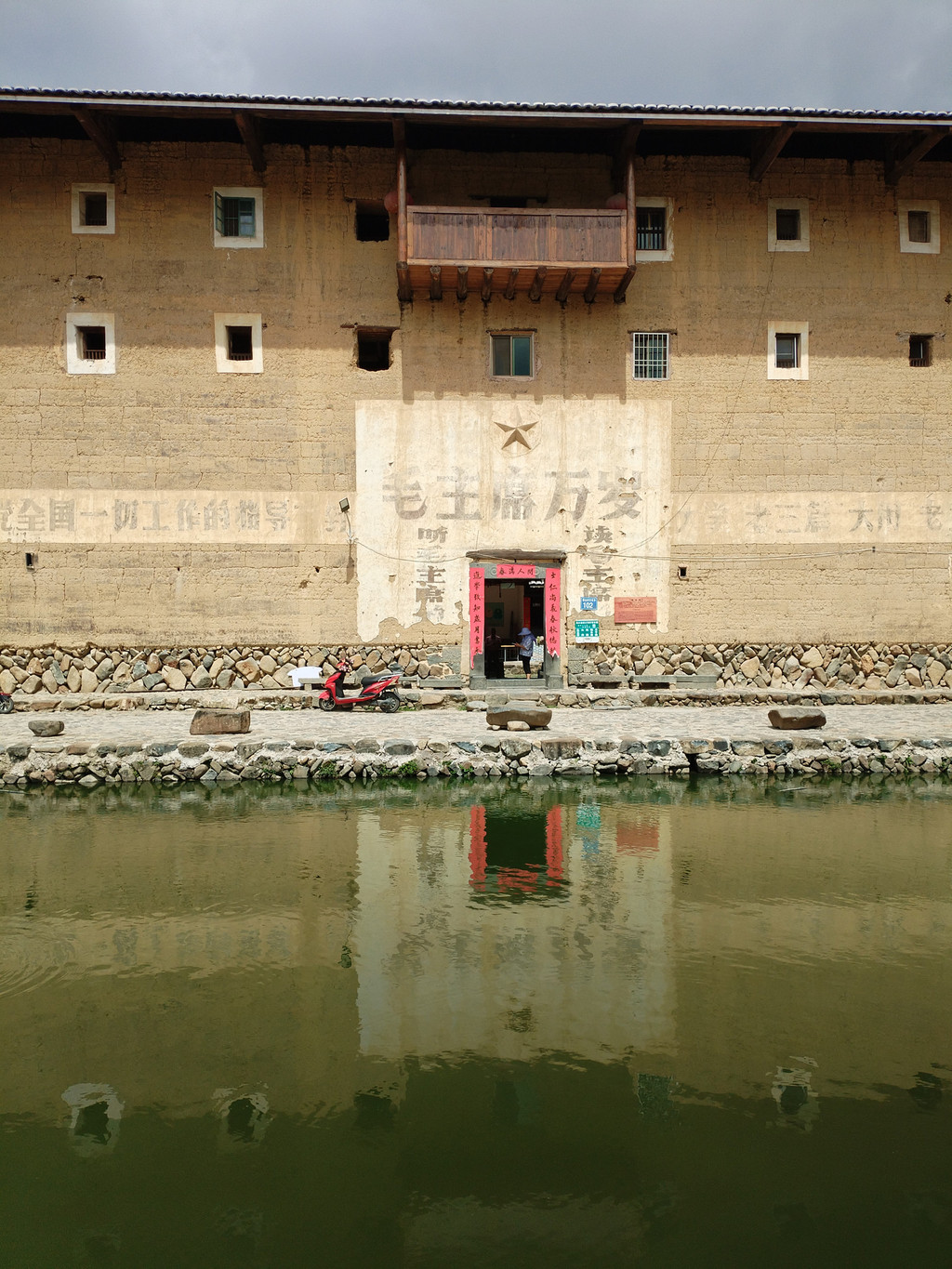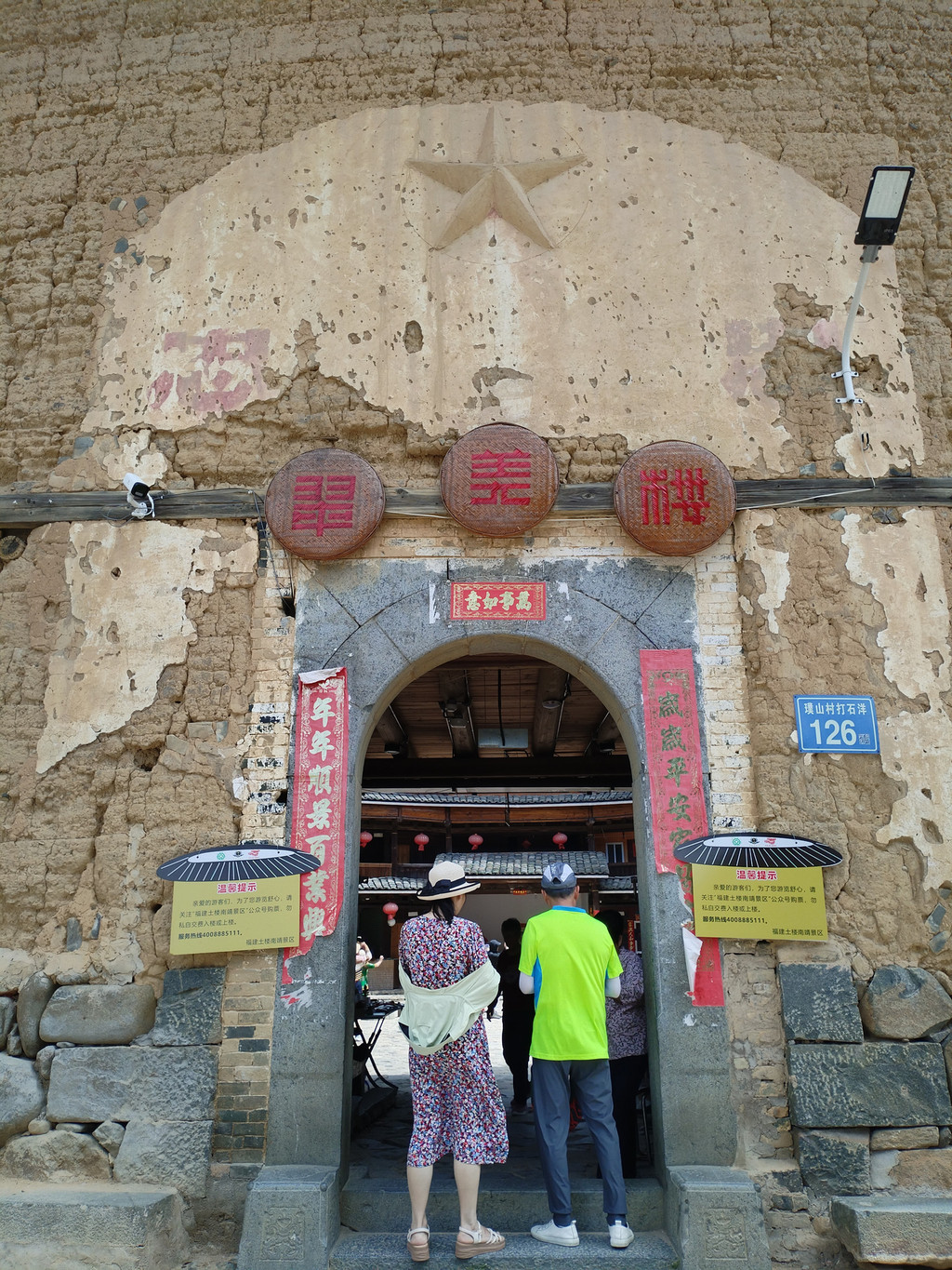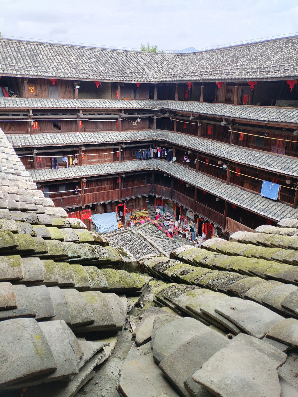 阿李早就听说过福建土楼,也看过很多土楼照片,但这次亲眼看到时,还是禁不住对土楼的精妙设计连连称奇。更让阿李惊奇的是,和贵楼竟然建在沼泽地上,历经两百九十多年和数次地震,没有倒塌,也没有下沉。阿李从一楼上到五楼,在每层的环形走廊上走了一圈,感受到了和贵楼厚重的历史感。从三楼到五楼,走廊外都有伸出去的屋檐——屋檐可以防雨防晒,还可以晾晒物品。从上往下看,四层屋檐整齐有序。阿李在五楼时,还特意看了一间房的窗户:窗不大,外面挂着红灯笼,可以看到土楼后面的绿树青山。而窗户墙壁的厚度让阿李再次惊讶:黄土筑成的墙壁差不多有一米厚!可以想象一楼的墙壁厚度是多少——一楼墙壁以石块为主要材料,一楼以上的墙壁以黄土为主要材料,墙壁厚度由下向上递减。难怪土楼还有防匪防盗防火防水的作用。