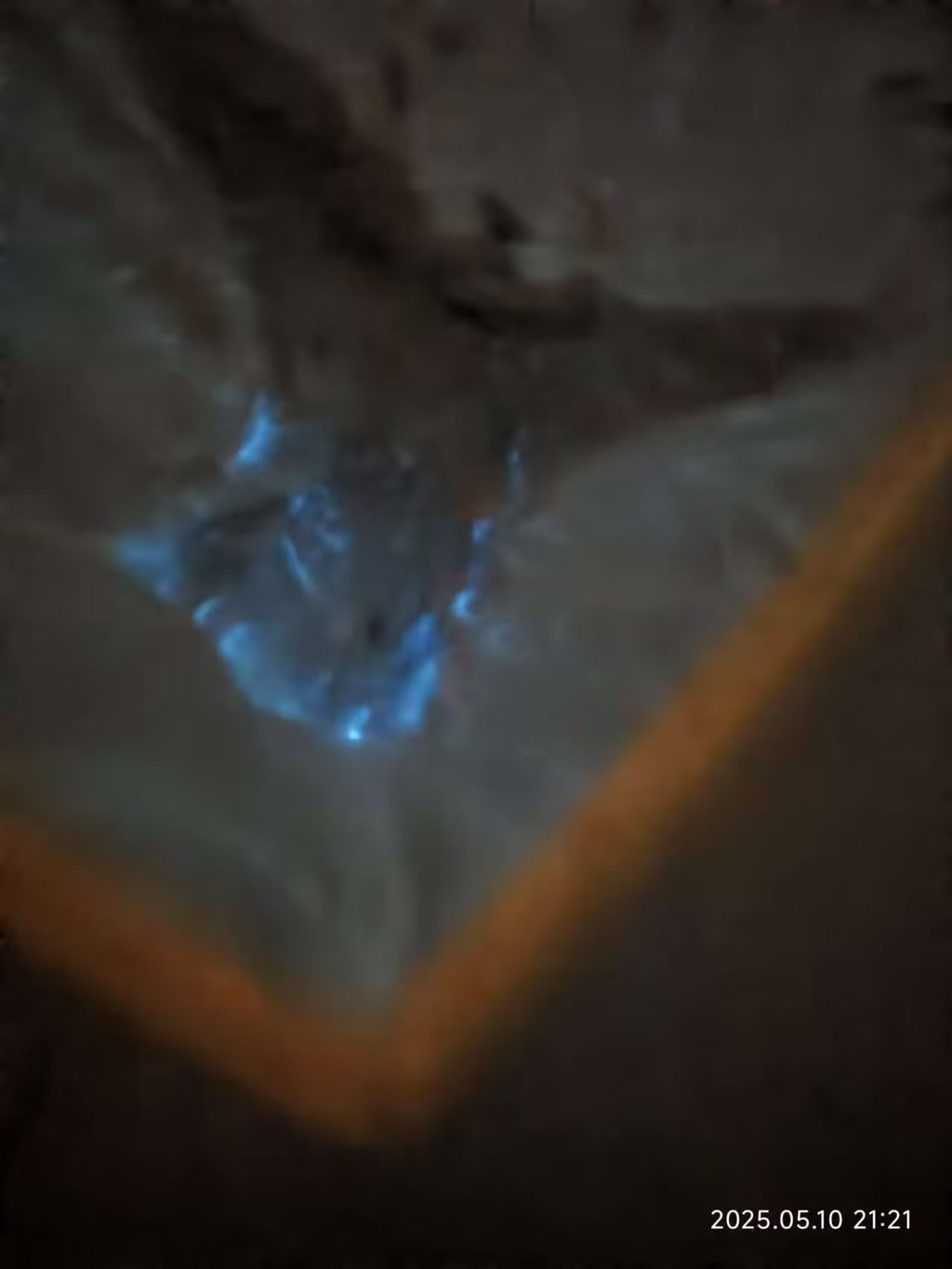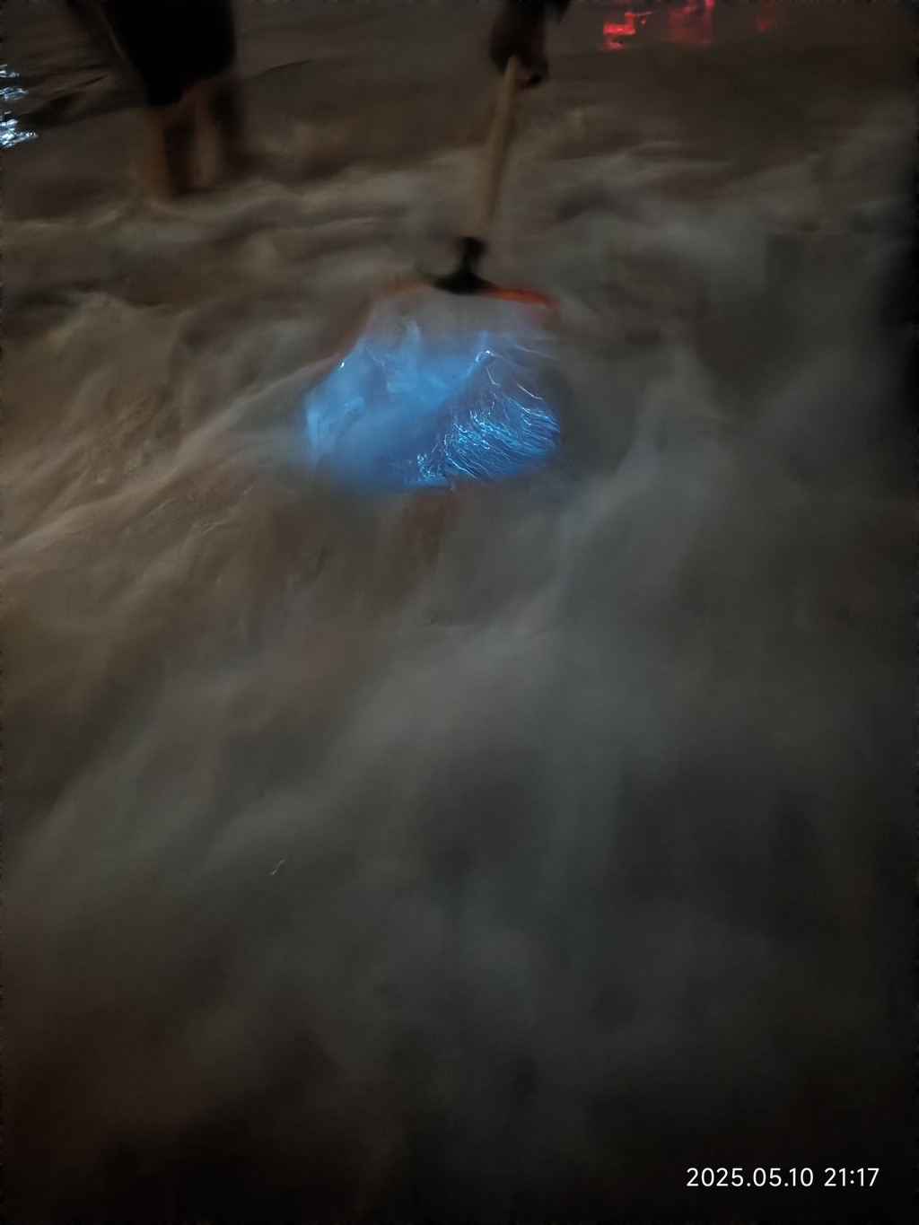 我们到平潭的那个晚上,部分团友去海边追寻蓝眼泪——平潭海坛岛的蓝眼泪声名远播,很多人来平潭主要是为了欣赏蓝眼泪。所谓蓝眼泪,并不真的是蓝色眼泪。它其实是海水中会发光的浮游生物受到海浪拍打时发出的浅蓝色的光,发光的浮游生物多了,就形成一片荧光蓝海,就像大海流出的眼泪。并不是所有的海边会出现蓝眼泪,也不是每个夜晚都有蓝眼泪。只有在特定地方特定季节的晚上,才会看到蓝眼泪。去看蓝眼泪的团友晚上八点就出发了,半夜十二点才回来——其实路程并不远,但那晚看蓝眼泪的人太多了,通往海边的路都被车子堵死了。好在他们很幸运,最终看到了蓝眼泪,堵了那么久也值了。阿李没有去看蓝眼泪,但阿李的旅游搭子去了,团友们也在群里分享了他们拍的蓝眼泪照片,阿李也算是间接看到了平潭的蓝眼泪吧。