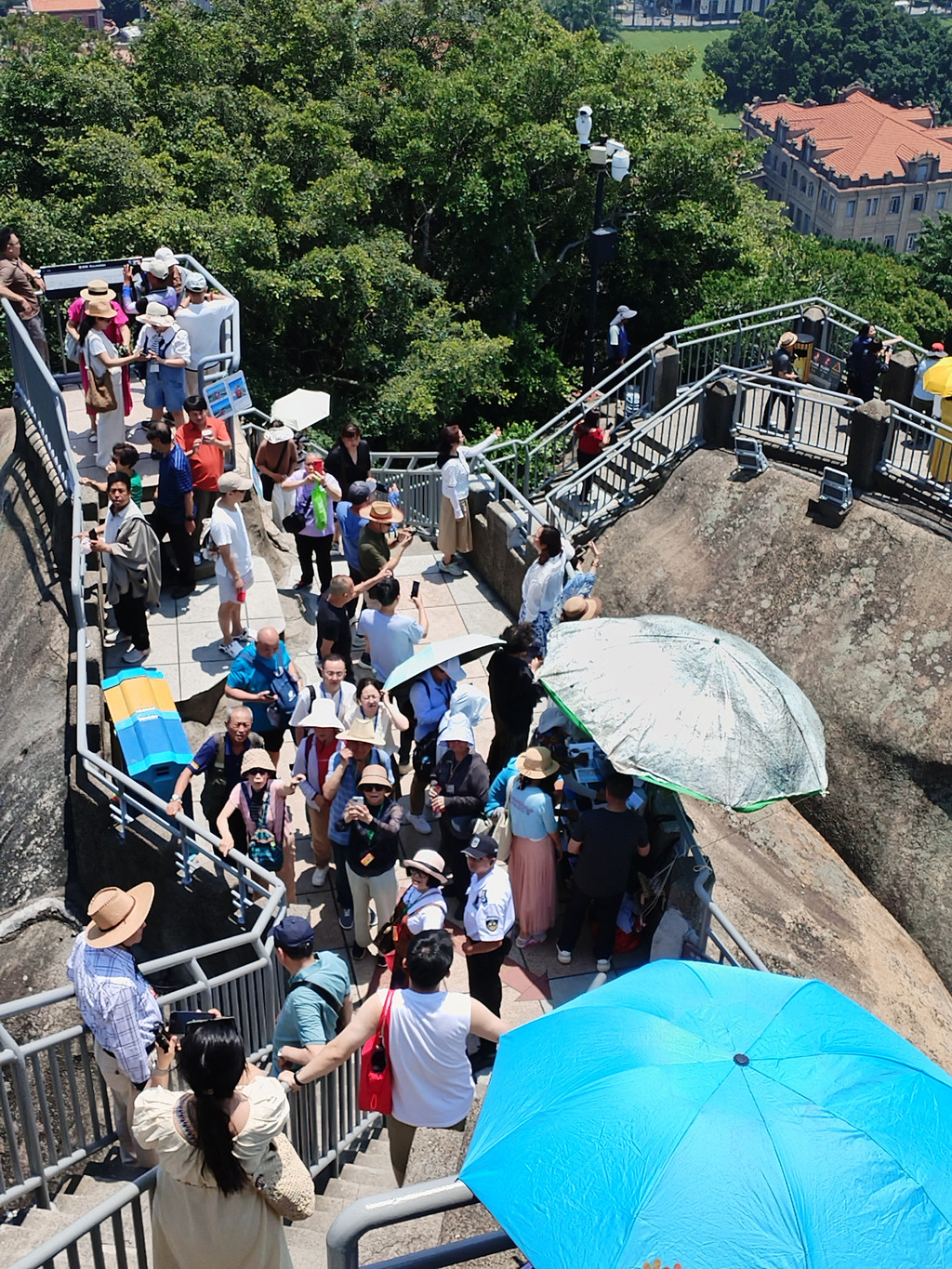 阿李和旅游搭子结伴攀登了天游峰。那天,红日高悬,天蓝云白,没有云雾遮挡我们的视线,武夷山毫无保留地向我们展开了它的山水画卷。我们从天游峰山脚一直爬到山顶,充分体验了天游峰的陡峭险峻:因为道路狭窄,上山的路是单行线,只上不下;过了半山亭,天游梯的八百四十八个窄窄的石阶只能靠自己一步一步攀爬上去;必须经过光溜溜的红褐色的鲫鱼背,两侧是深达百米以上的陡峭山崖和幽深峡谷,并且非常狭窄,最窄处只有一米左右;接近峰顶的最陡一段路坡度近乎七十度,前面游人的脚下就是后面游人的头顶。好在不管登山之路多么险峻,路旁都有坚固的护栏。阿李手扶栏杆奋力前行,终于成功登顶——尽管汗水湿透了衣裳。