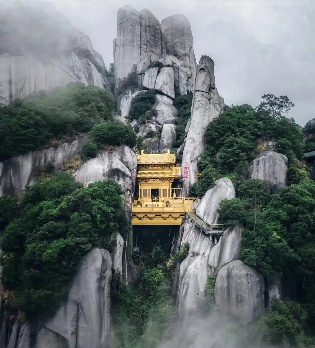 阿李认为,太姥山中最奇特的建筑应该是一片瓦禅寺的大雄宝殿。一片瓦禅寺本身就很奇特:它始建于明朝万历年间,位于太姥山九鲤朝天峰附近一岩洞里,一块巨大的岩石像瓦一样盖住了它,因此得名“一片瓦禅寺”。而它的大雄宝殿更是奇特:它是我国首座、全球唯一的悬空铜殿,纯铜铸造,用铜一百五十多吨;建造时间长达十年——2001年初开建,2011年底建成;大雄宝殿背靠九鲤朝天峰,左靠升天石,右邻莲花峰,下方为深谷,前眺东海,浮空而立。整座建筑在太姥山悬崖峭壁的衬托下,显得格外庄严肃穆。