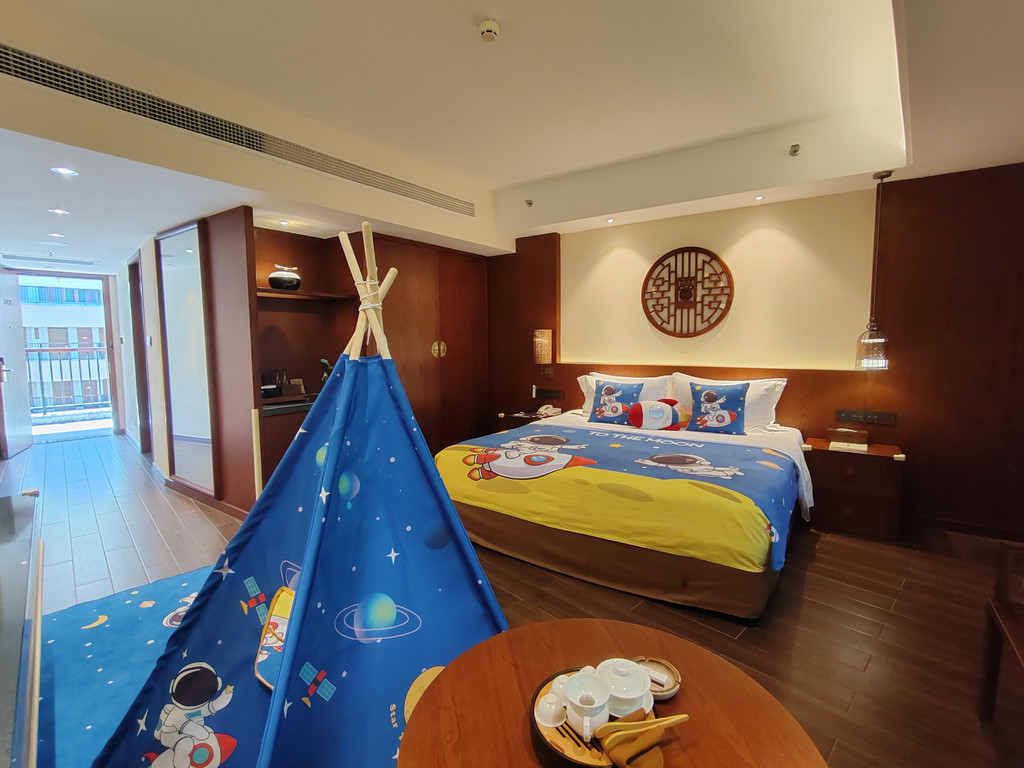 办理入住后,走进酒店特色亲子套房,小孩立马被里面的超大空间、童趣布置和星空帐篷吸引住了,我的宝贝秒变探险家!🌠 落地窗外冠豸山景如画,让小孩在大自然怀抱中入睡。