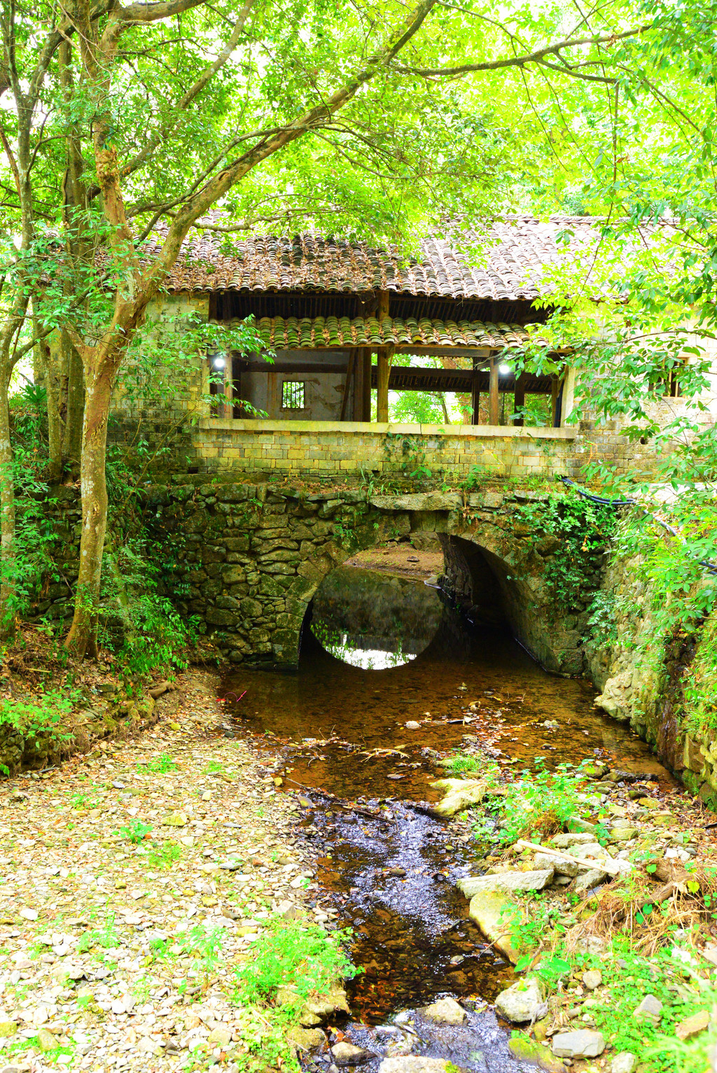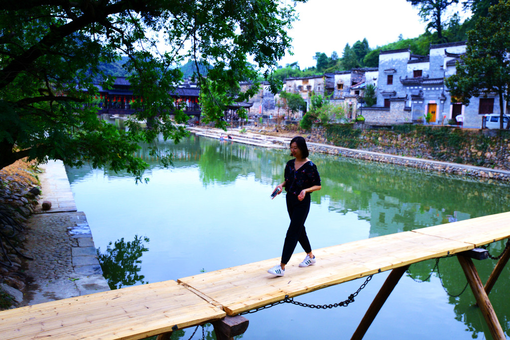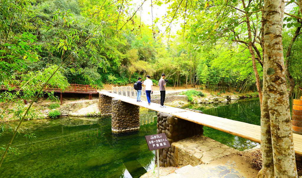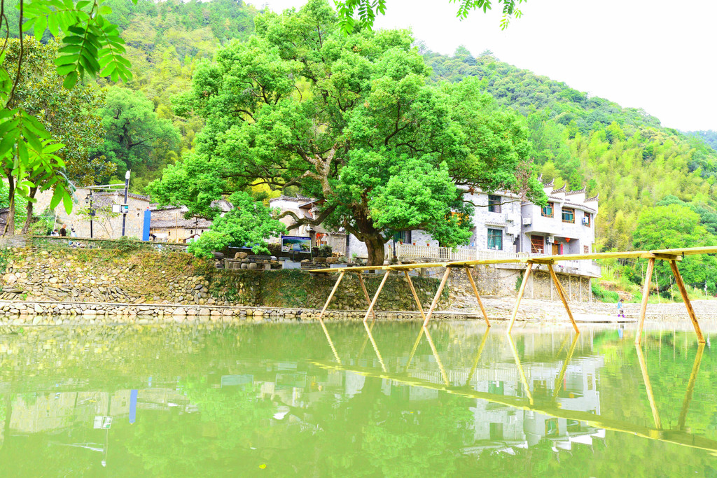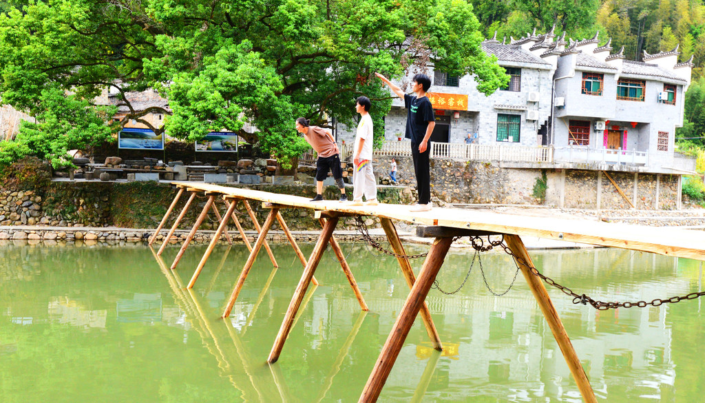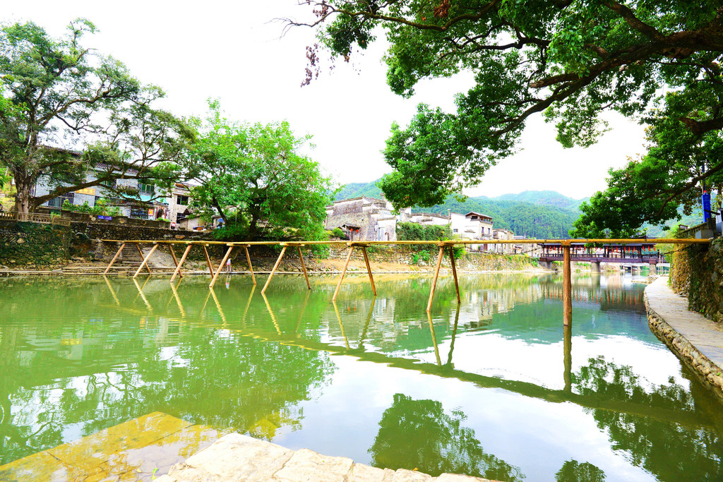 几座桥横跨两岸,首尾两座是木板桥,尤其是北面那座,掩映在古樟林之下,成了网红打卡点。