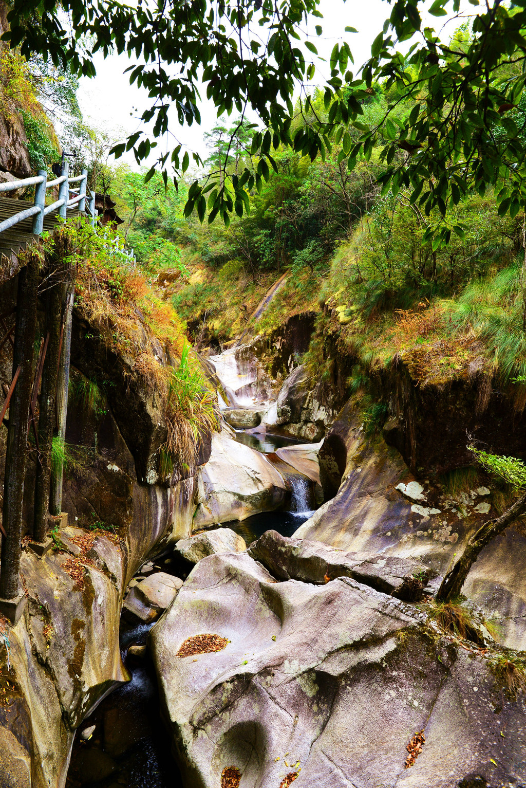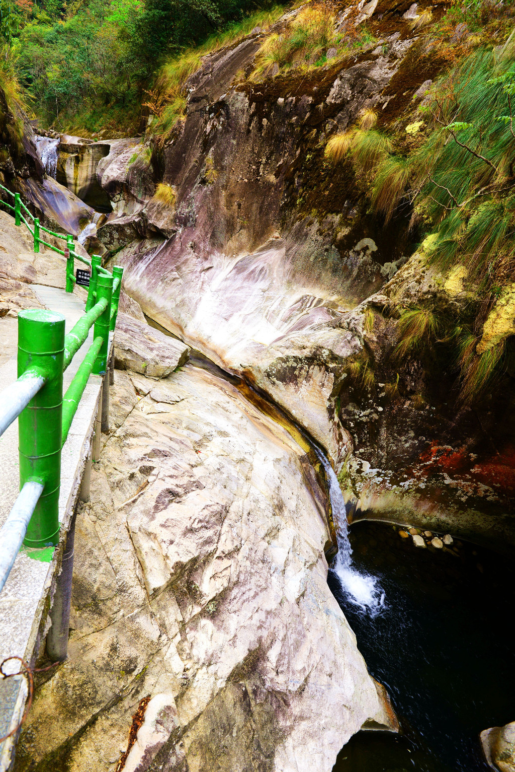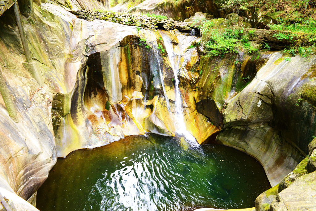 山上冲下来的水从峡谷中穿流而过,两侧有的是光滑的斜面,有的是陡峭的岩石。