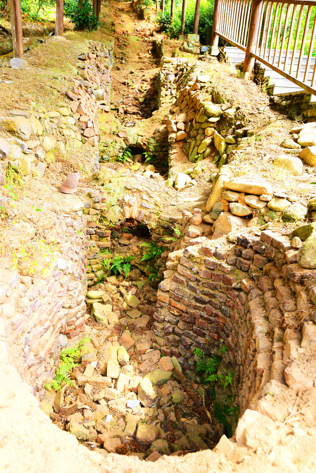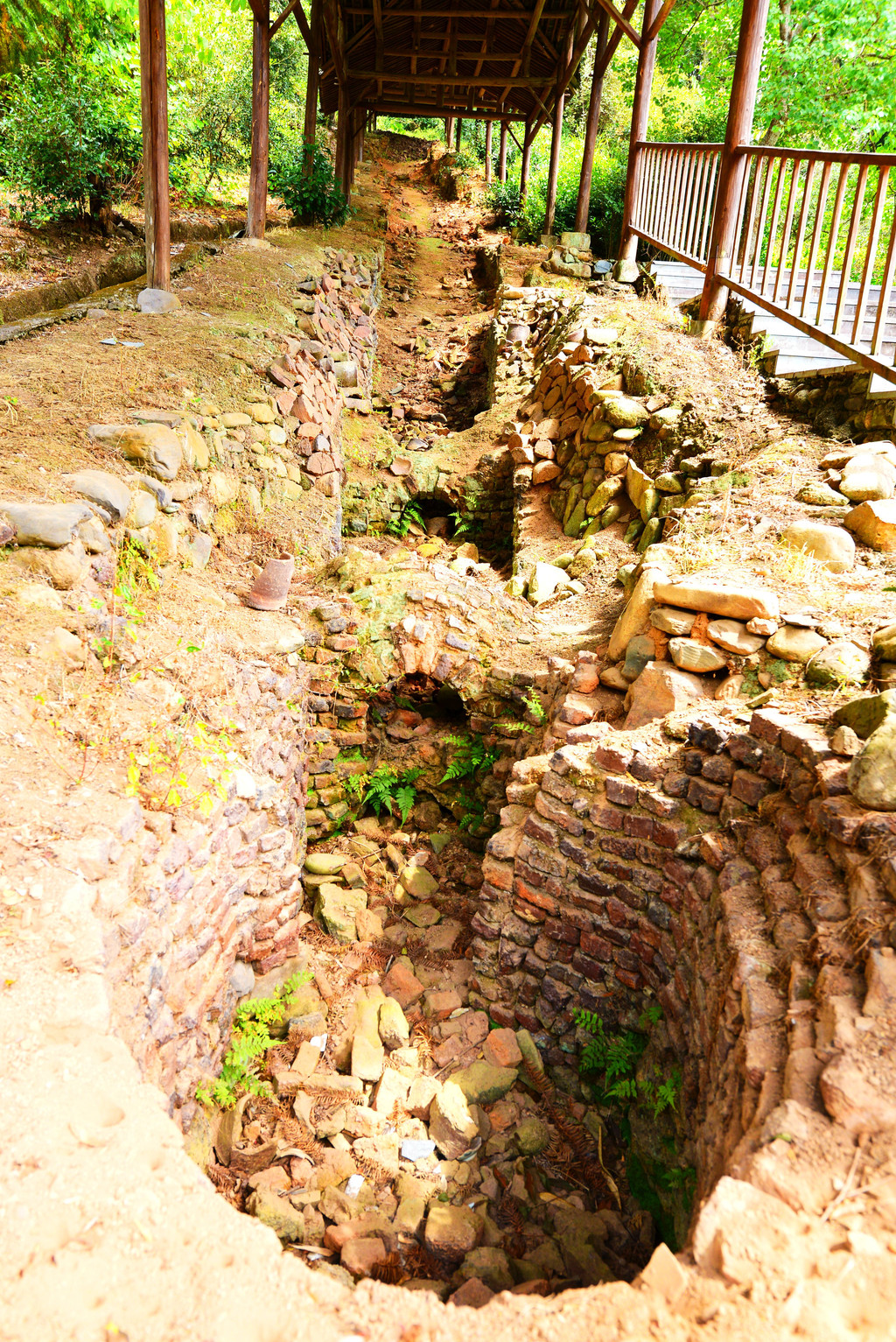 窑室分窑头(火膛)、窑床、窑尾(烟孔)三段,不同位置其窑温不同,下段700℃—1000℃,中段1300℃,烧高脚杯、灯盏、碟子等精美小物件,上段1300+℃,烧壶瓶等大物件。