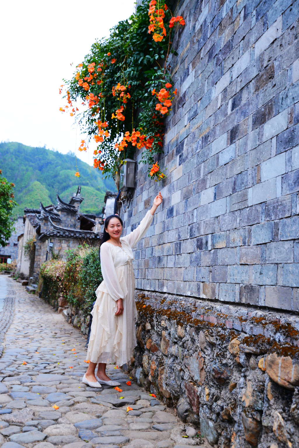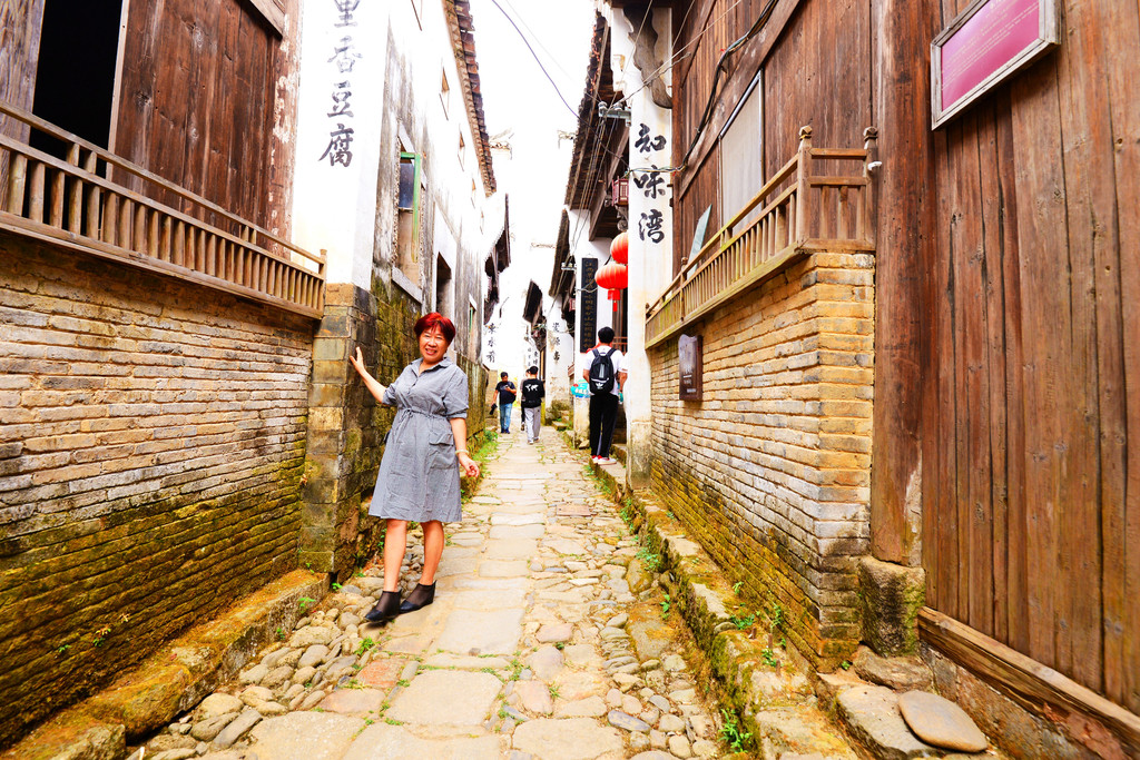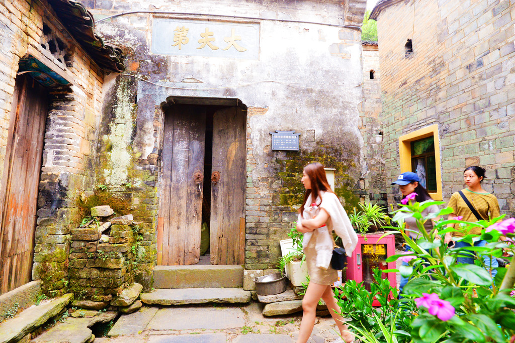 翰林第、大夫第、刺史第、进士第等官邸随处可见,昔日无比光耀的大夫第,曾经的书香门第人家,今日暗淡了几分,幸好门前的几盆花给它鲜活了几许,还有这路过的三位美女。