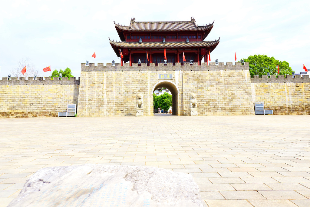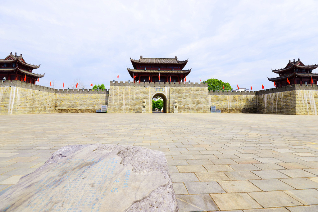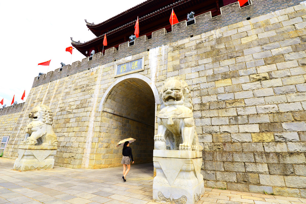 历史文化长廊的尽头出现了一座城门楼,由主楼和两座角楼组成,主楼座落在8米高的城墙之上,登上城门楼可一览古城全景。