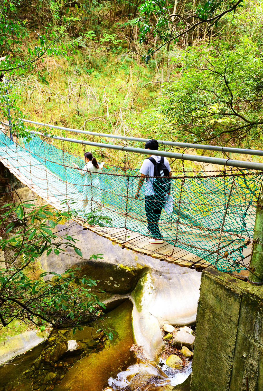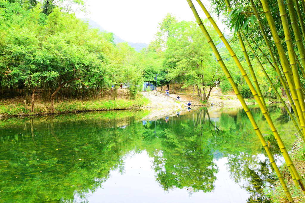 两位美女、一位小哥哥在河中石头小路上戏水和拍照,让这幅山水画活色生香起来。