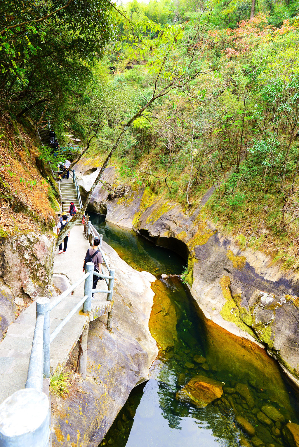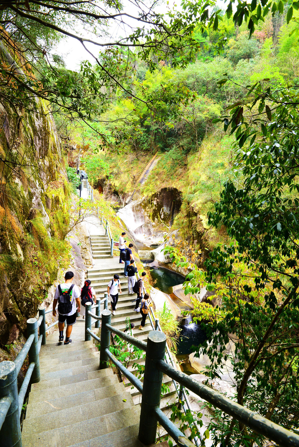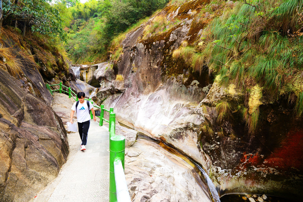 进入景区后只有一条游步道,两侧是原始森林,峰峦叠嶂,古木参天,树上挂有牌子,教你认识红豆杉、甜槠、楠木、酸枣木等。树龄大多数百,有一些树要几人才能合抱,非常粗壮。这一段景色我没拍一张照片,回到家就后悔了。
