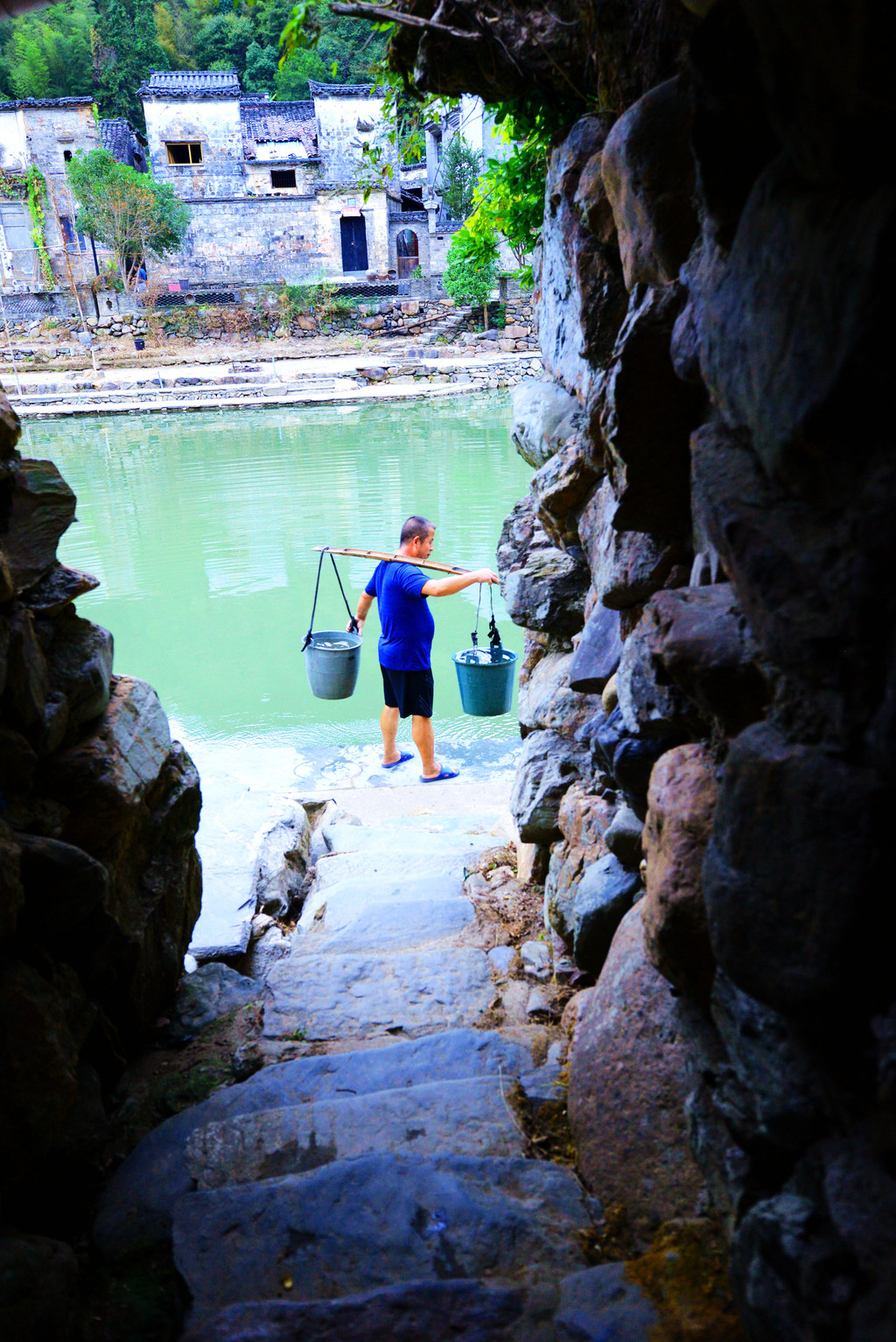 大叔挑着一担水,步伐坚实地走上坡岸。
