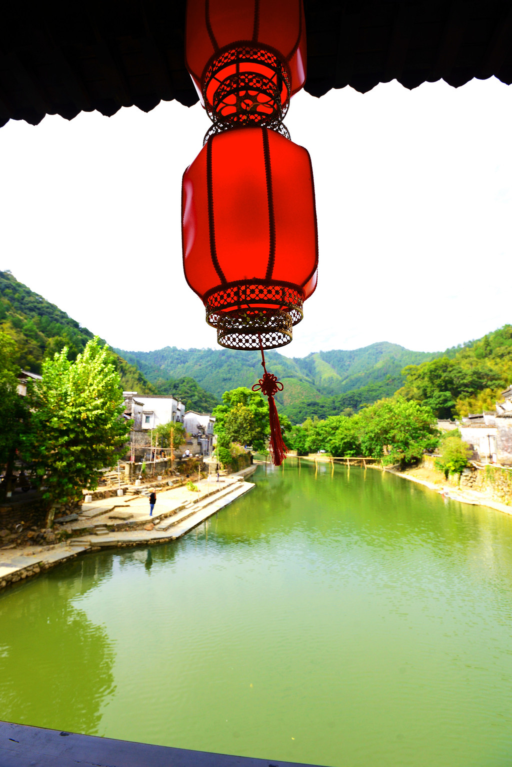 站在桥上远眺古镇,山峦绿意葱葱,植被茂密,河水浸染成绿色;山下飞檐翘角,粉墙黛瓦,总让人想起纪录片中的画面。