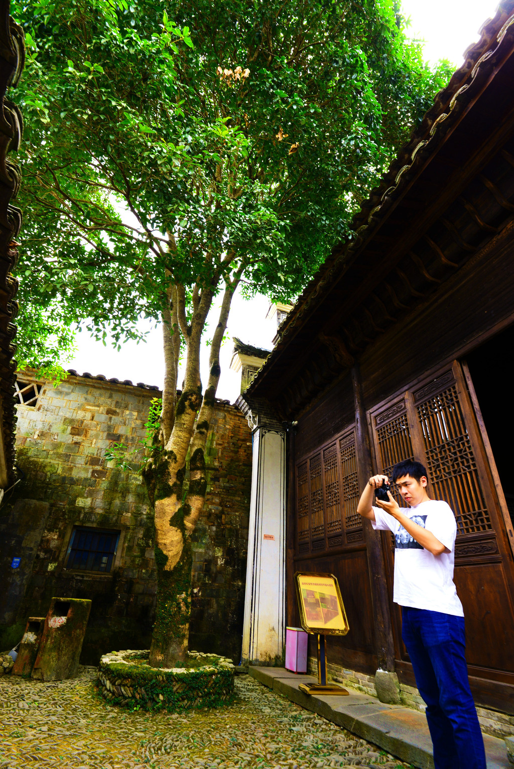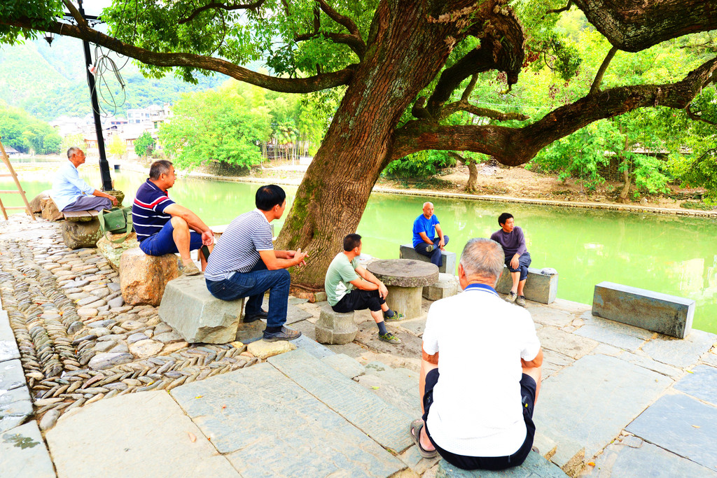 大樟树下围坐着七、八个居民,有一搭没一搭地聊着,古镇保持着原生态的生活模式,散发出闲适安详的气息。朴实的民风和优美的环境,让人流连忘返,难以离别。