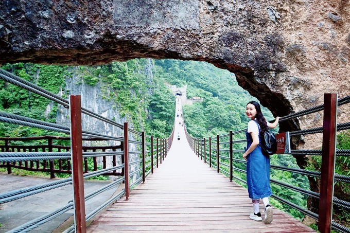 这座桥叫做“天门洞索桥”,索桥由“天门洞”穿过一仞绝壁,人从“天门洞”步入索桥犹如“穿墙而过”,这些因为剧烈地壳运动所致绝壁裂缝,是大自然的鬼斧神工。