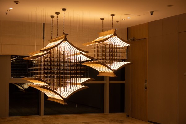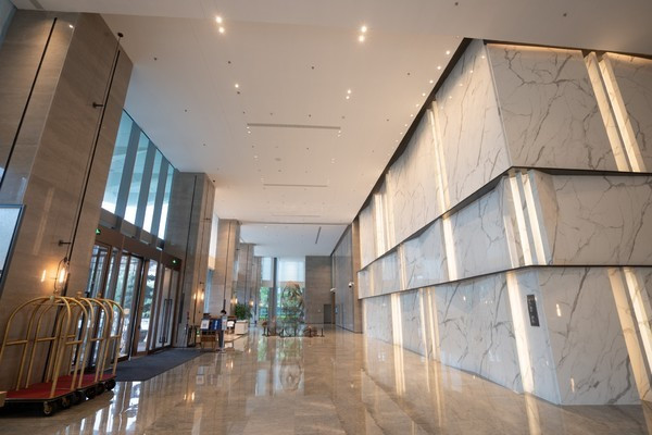 从动车站过来20分钟就到了,很是方便,到达门厅是一个气势磅礴的两层挑空的大堂过度空间,正面以福清礁石灵感,采用用现代的设计手法,以金属、石材,重新演绎海边礁石起伏的天然形态,契合“归源”这一主题。一个4米高,以“礁边拾忆”为主题的金属雕塑坐落在门厅与宴会入口处中央。