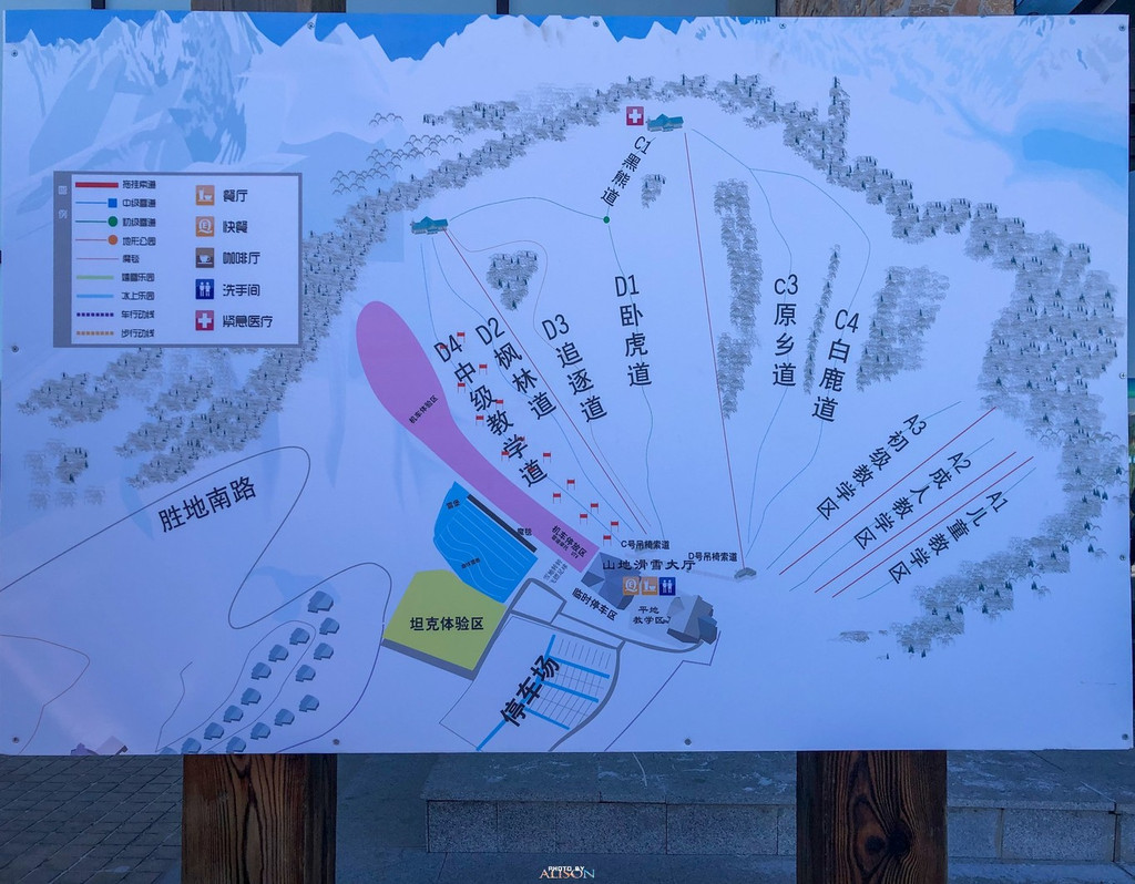 滑雪场共有中级教学道、枫林道、追逐道等几条不适合初学者的道。另外还有初级、成人和儿童三条教学道适合新手滑雪。