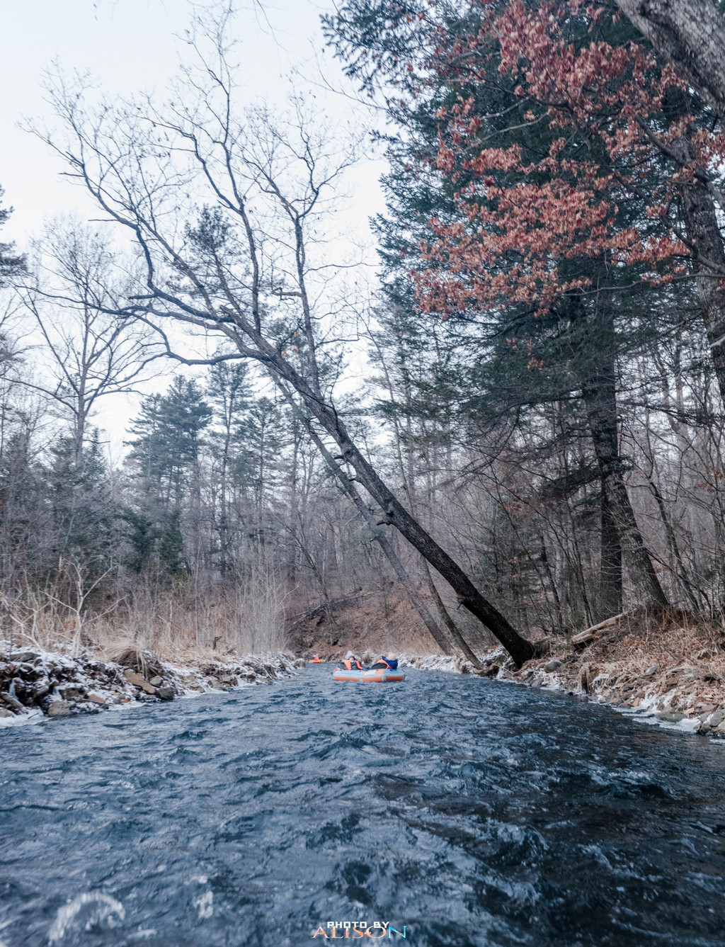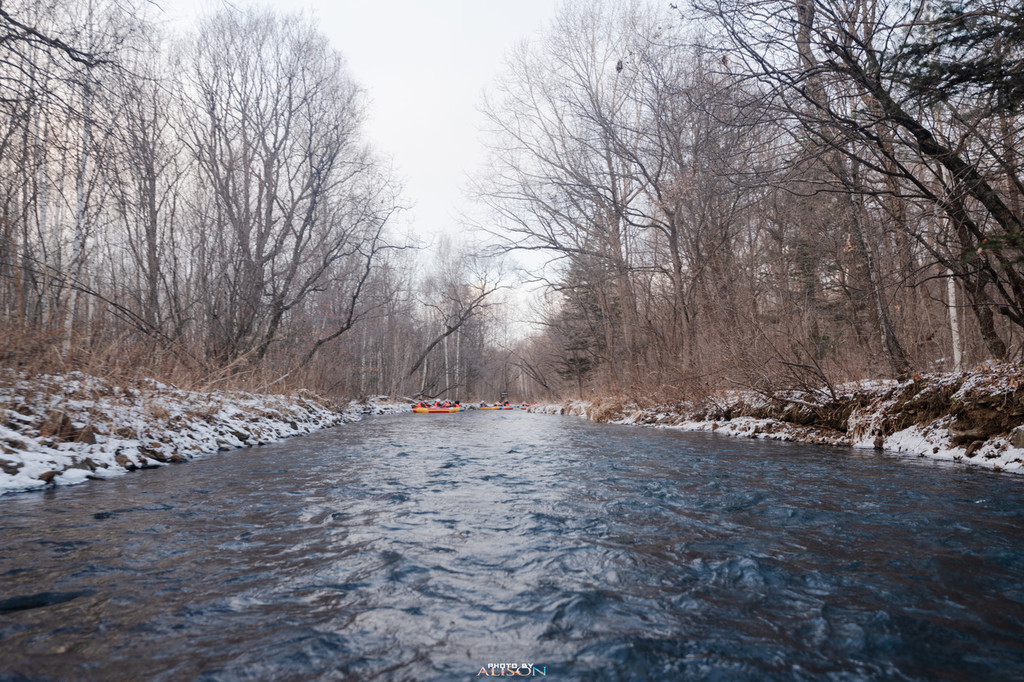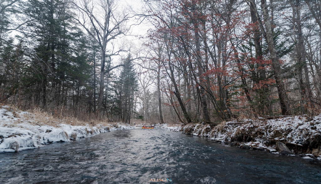 漂流过程中景色是非常美的,河道两旁的树木枝丫向上生长,部分枝丫斜挂对岸,与白雪相互映衬,在河水中形成些许倒影,远看甚为壮观,水流溅到身上或者是相机镜头盖上,极快地形成了冰块,仿佛自己身处魔界一般🆒