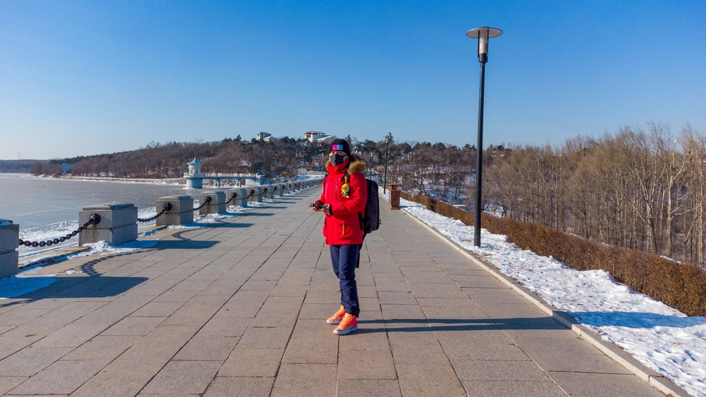 乘坐接驳车往回走的路上,我选择在水库大坝下车,在这里更加空旷的地方,可以放飞我的无人机,好好感受净月潭的美。