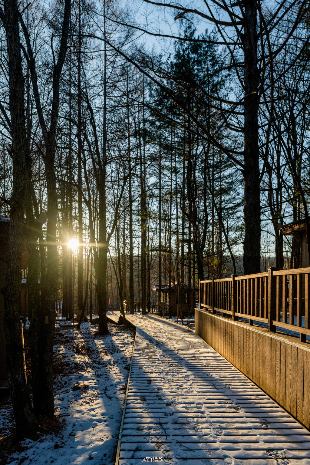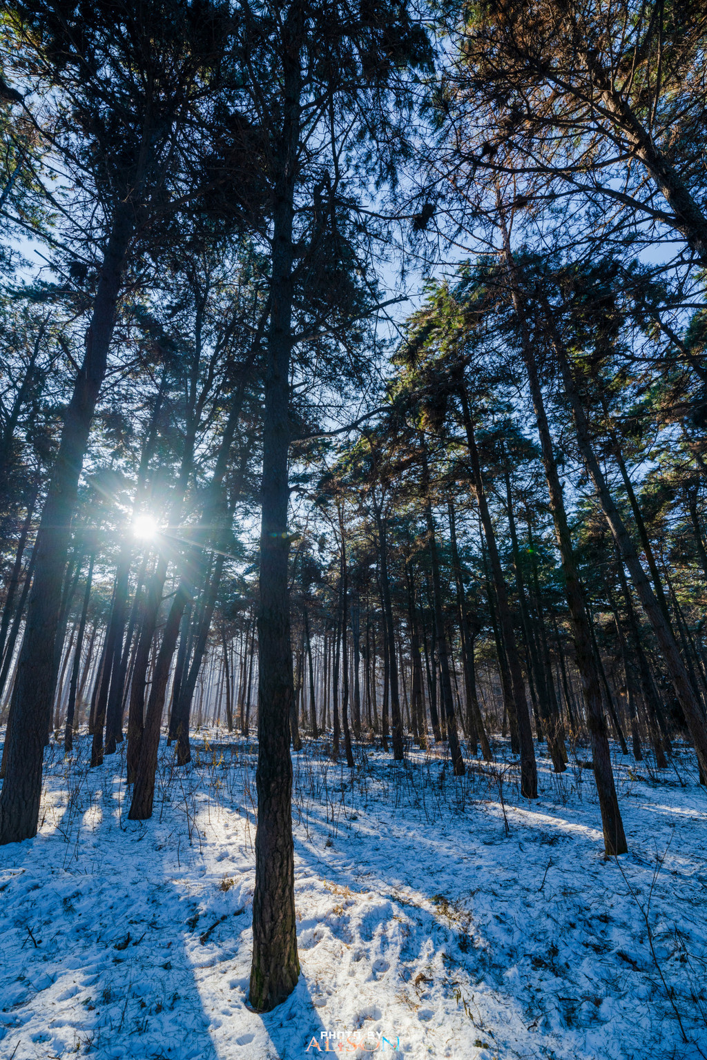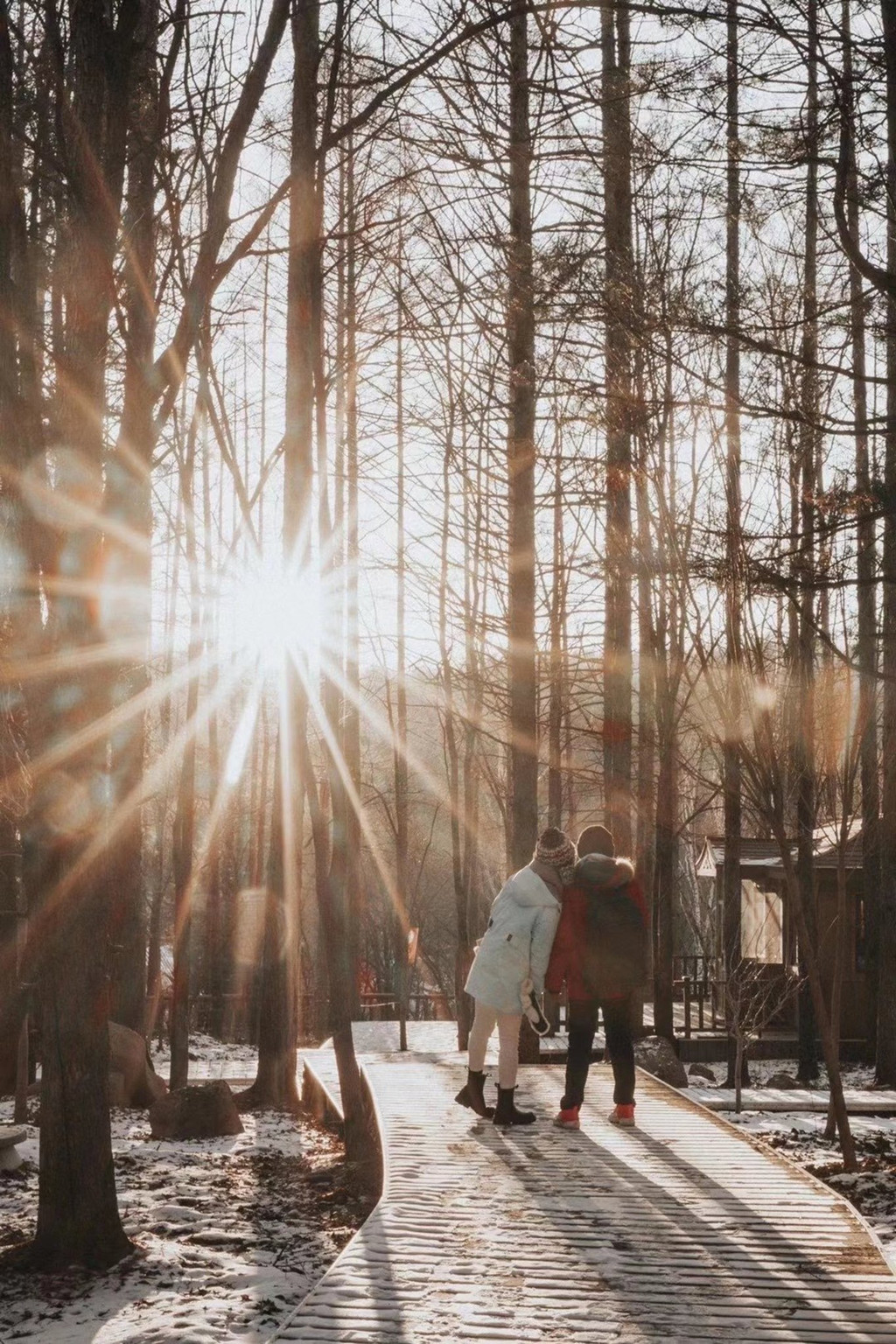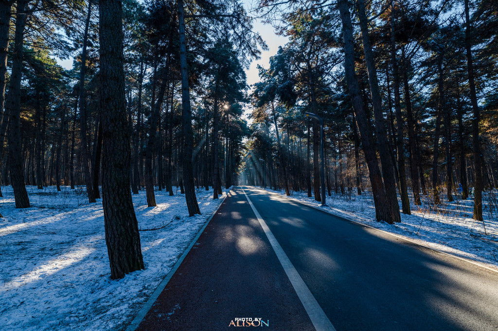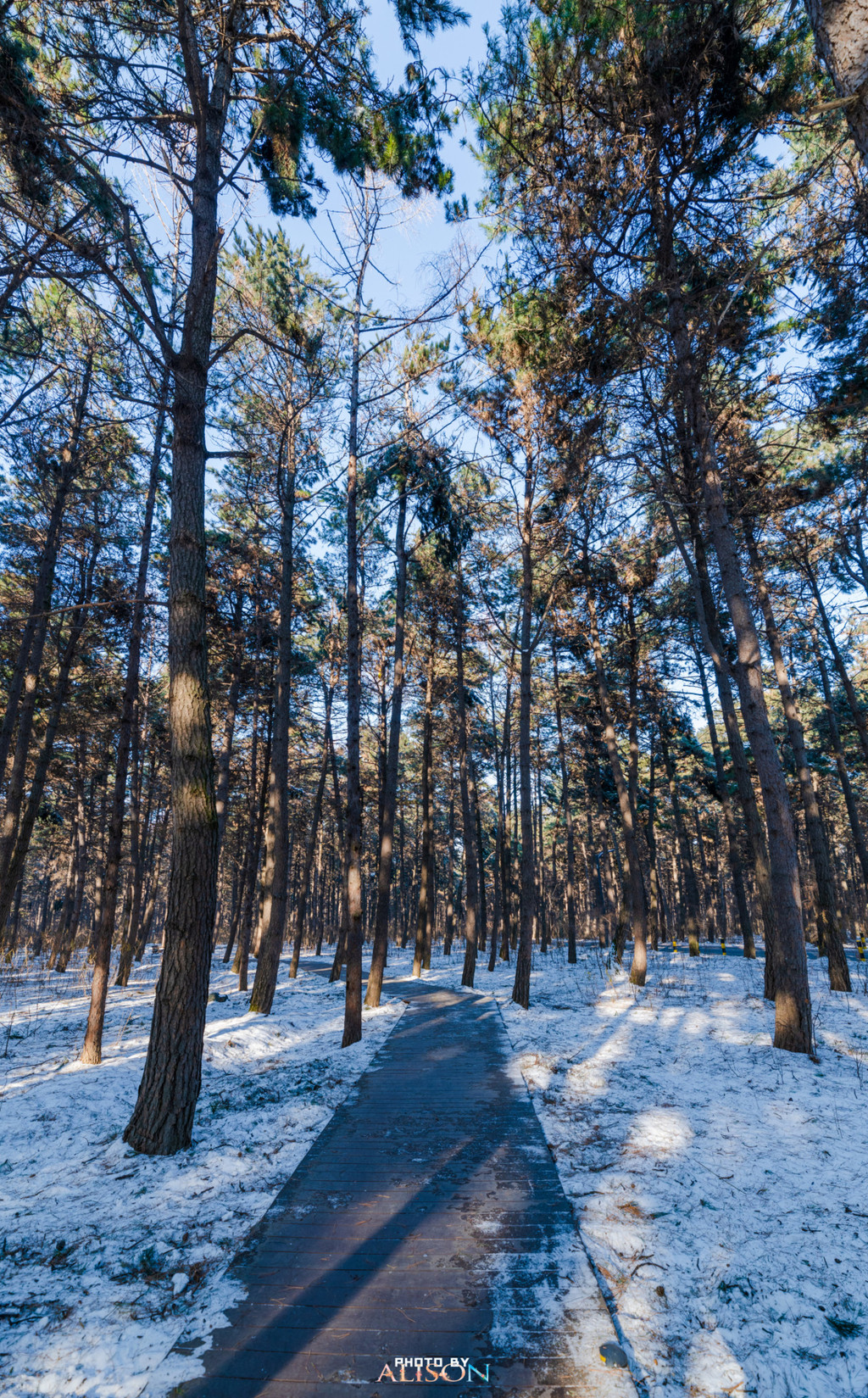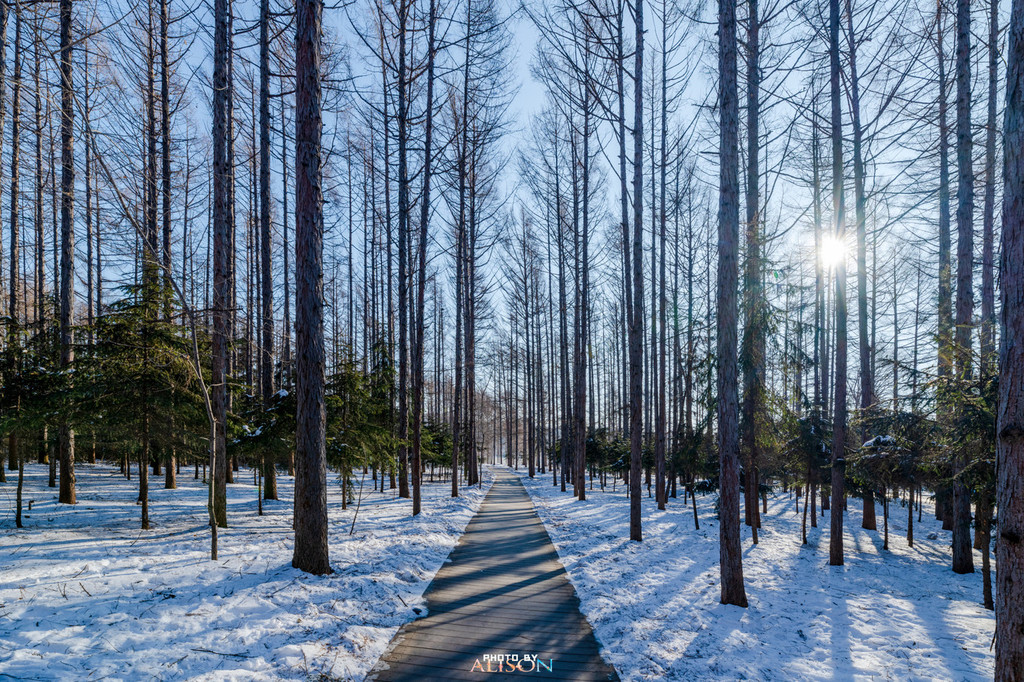 我选择下车的第一站是森林浴场,这里也是净月潭的核心景区,于1999年对外开放,有着“天然氧吧”的称号。郁郁葱葱的树仿佛从雪中窜出来直插天空,阳光透过缝隙撒在路面上,形成一束束的光,真的是说不出的美