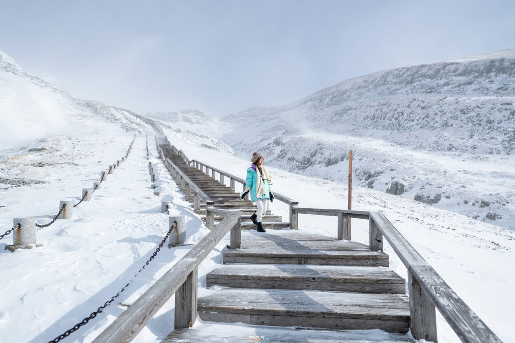 乘坐中型巴士到达步行栈道的起点,风异常的大,云雾缭绕的,站在栈道口我们远远眺望了山顶的风光。最终我们决定放弃登顶看天池,坐车下撤回到半山腰的雾凇景观处拍照。