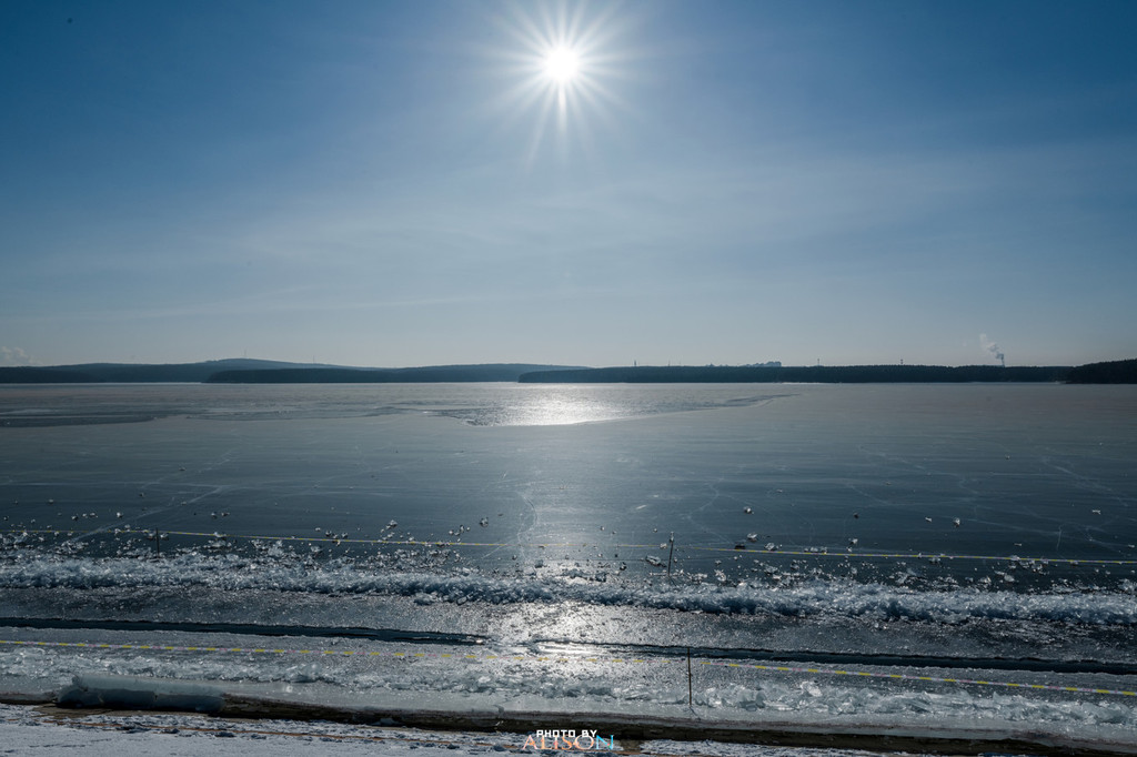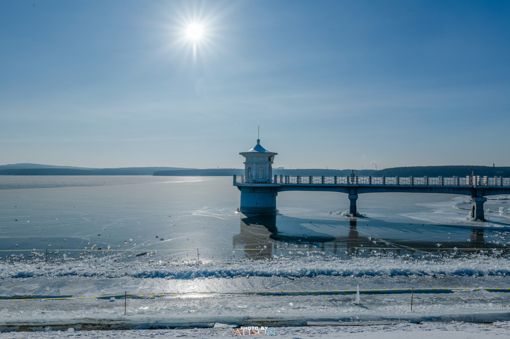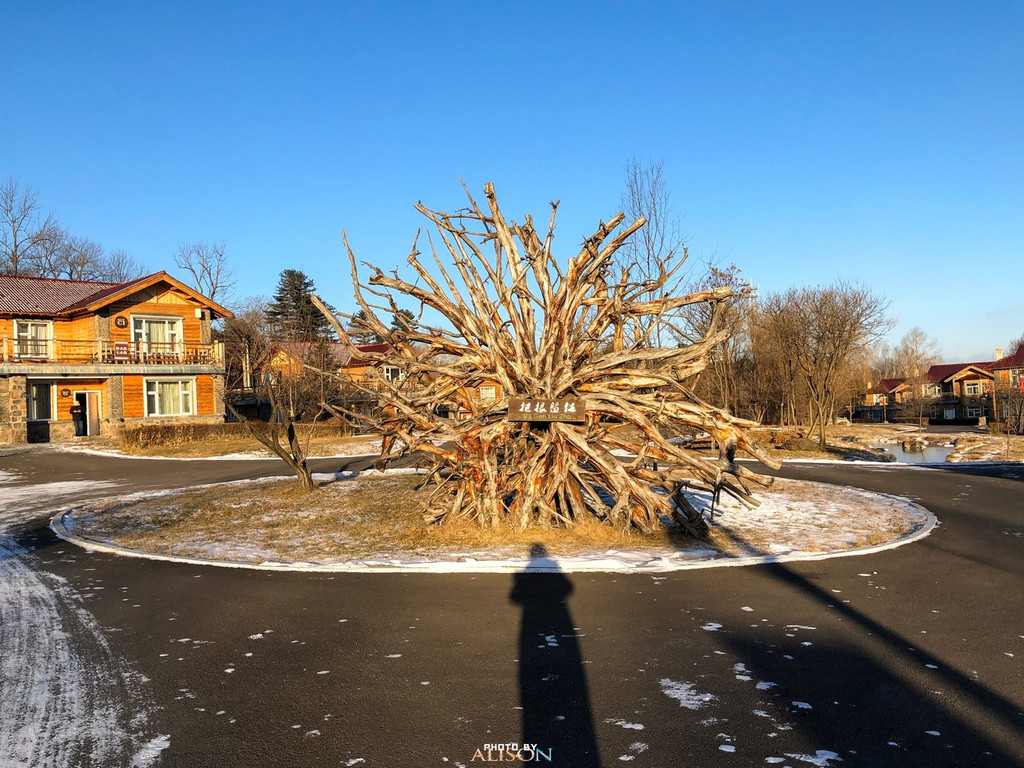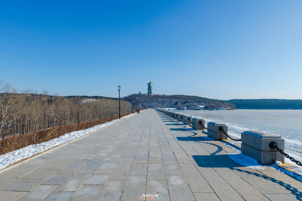 结冰的湖面拉起了安全线,禁止游客上冰面,同时我看到有不少工人在取冰作业,接驳车司机说取冰是为了马上要开幕的冰雪节建冰雕用的