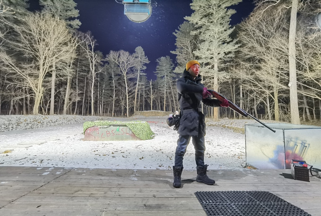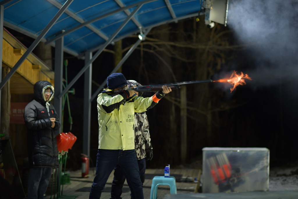 冬漂结束天完全黑下来,狩猎体验活动开启。猎枪实弹射击,声浪大后坐力足,一开始是固定靶,之后打移动飞碟,试了4发弹体验了一把被枪声震慑的威力