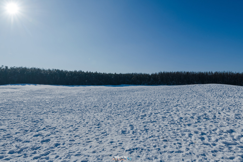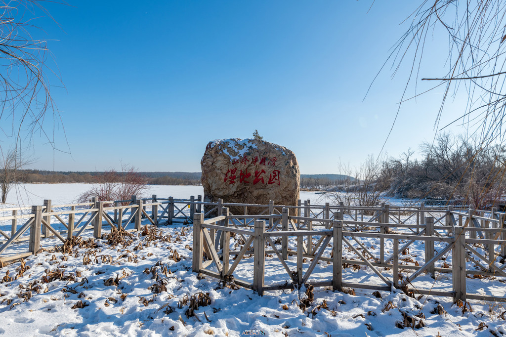净月潭景区内接驳车的终点站就在高尔夫球场、湿地公园这,高尔夫球场早已被一层雪满满当当覆盖,旁边湿地公园同样也是被冰雪封住的美景。