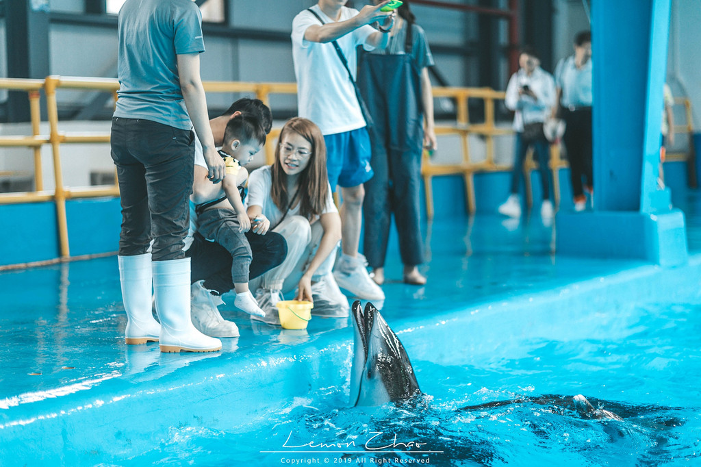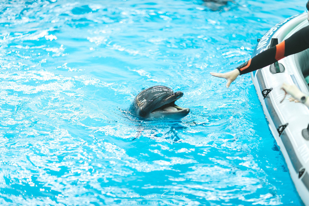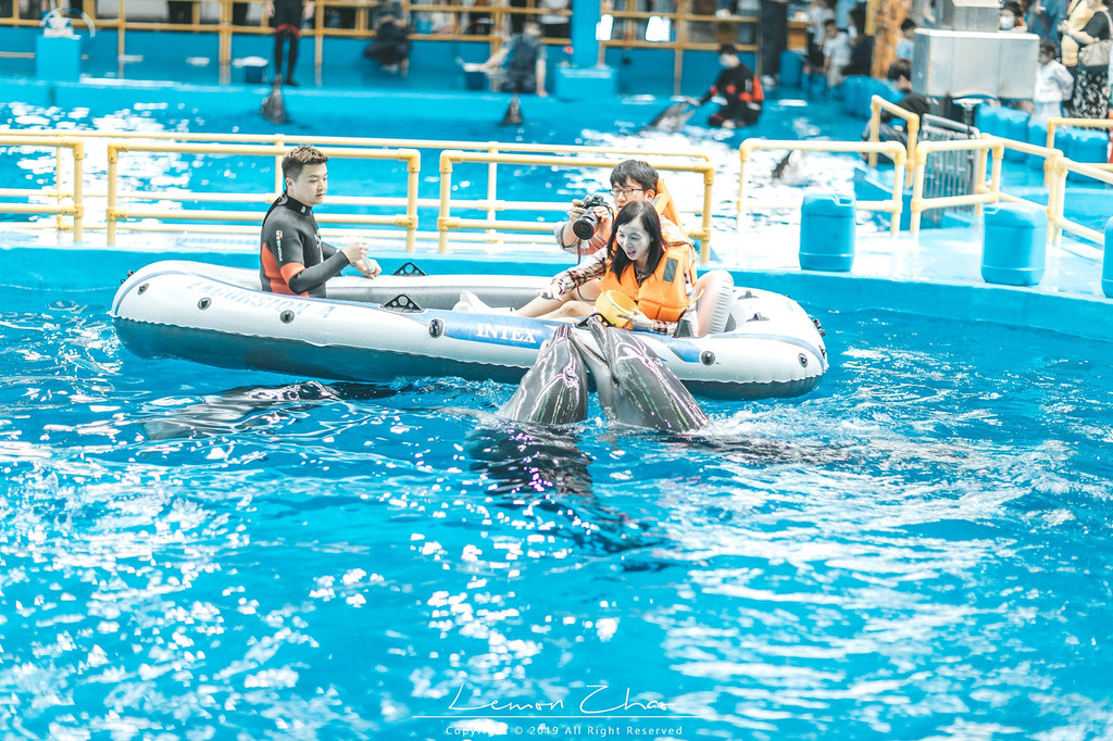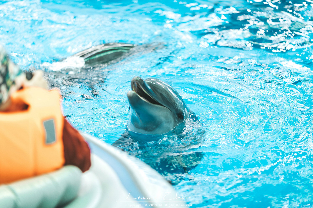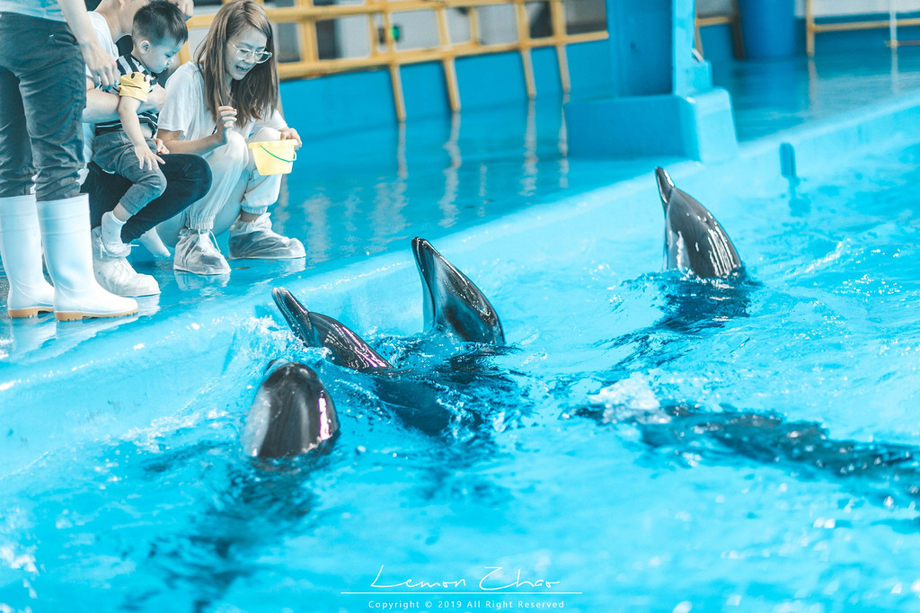 虽然之前也曾出海追过海豚,但是都无功而返;虽然也曾去过海洋馆,但是都未曾如此近距离地看过海豚。除了常规的表演节目外,游客还可以付费体验海豚互动环节。可以在岸边给海豚喂鱼,让海豚可以加个餐,最刺激的当然是乘着船,在水池里和海豚共游了,真的是前所未有的体验。