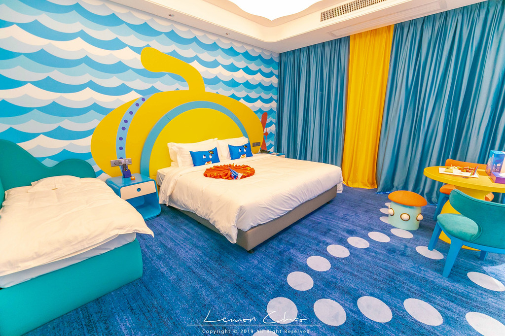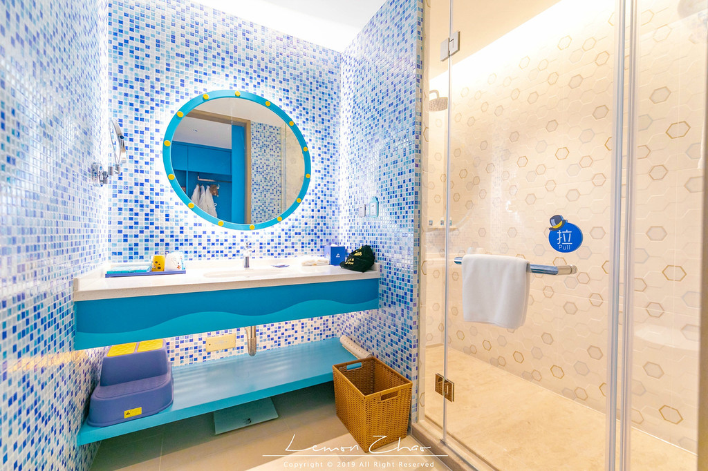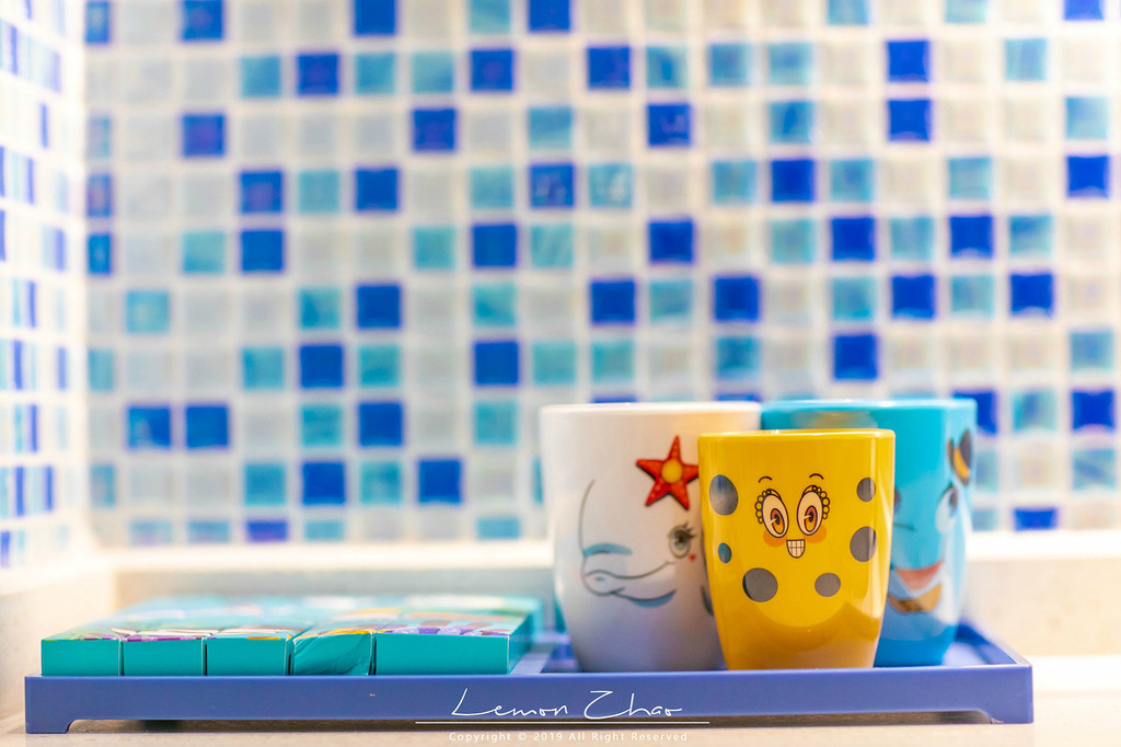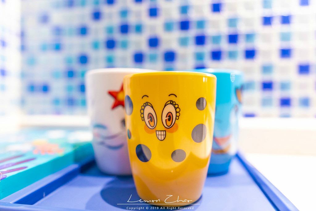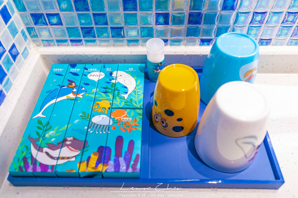 海豚、白鲸、鲨鱼和水母四种元素充满了整个房间,这是酒店的特意打造的“海底奇乐小队”的冒险故事,可以激发孩子们的兴趣。房间内能看到的所有用品都是定制的,可以说是非常用心了。海豚的靠枕,鲨鱼的垃圾桶,一家三口定制的洗漱杯,就连洗发水、沐浴露、护发素这样细微的地方也都贴上了可爱的卡通人物,真的太爱了,这才是属于我的童话世界啊,整个人完全被这些可爱的形象萌得放松了下来,一扫一路奔波的疲惫。