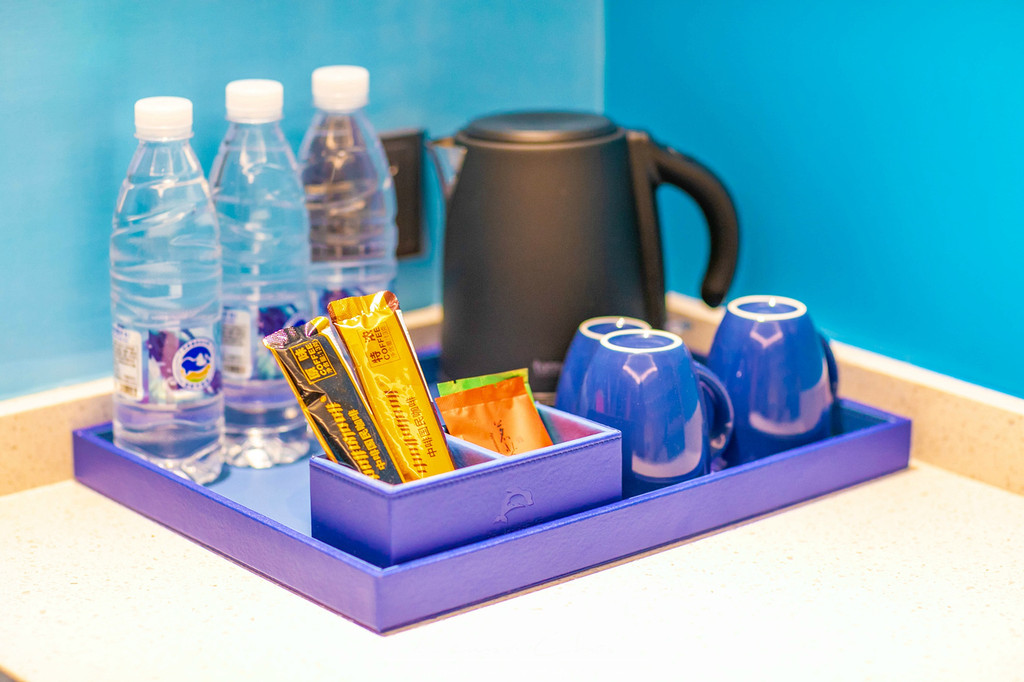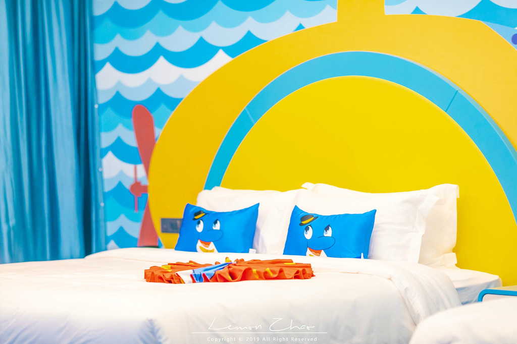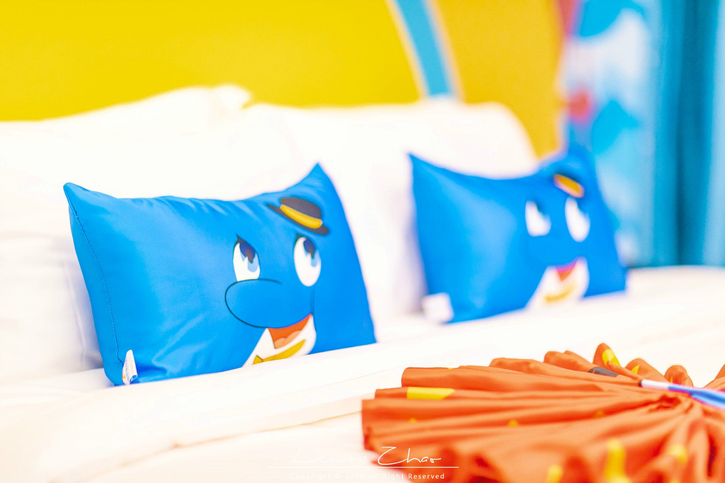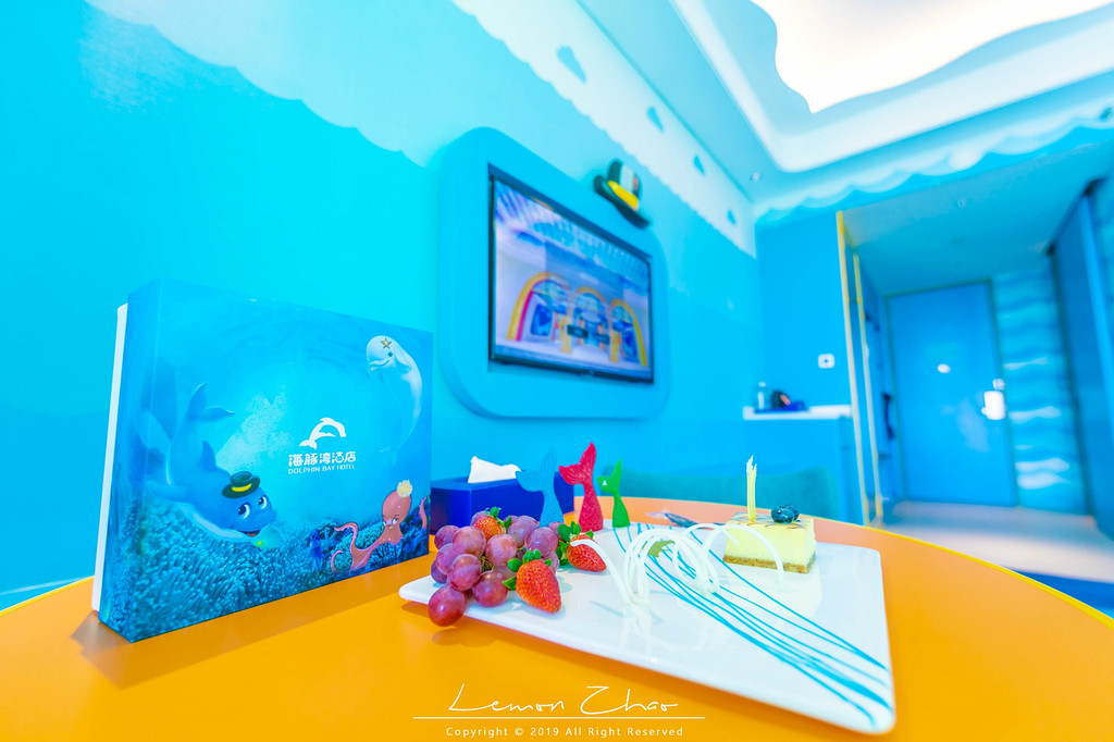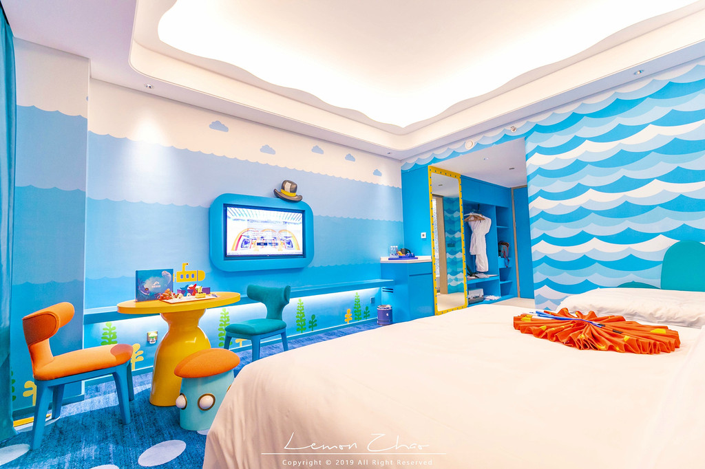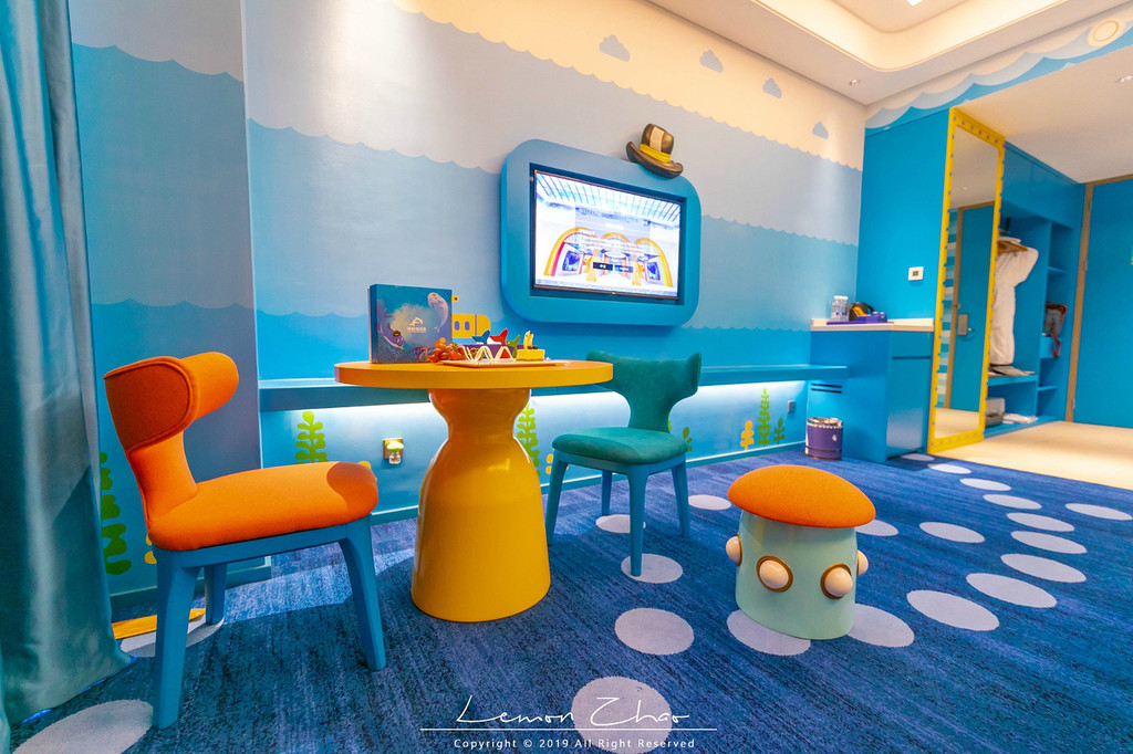 海豚、白鲸、鲨鱼和水母四种元素充满了整个房间,这是酒店的特意打造的“海底奇乐小队”的冒险故事,可以激发孩子们的兴趣。房间内能看到的所有用品都是定制的,可以说是非常用心了。海豚的靠枕,鲨鱼的垃圾桶,一家三口定制的洗漱杯,就连洗发水、沐浴露、护发素这样细微的地方也都贴上了可爱的卡通人物,真的太爱了,这才是属于我的童话世界啊,整个人完全被这些可爱的形象萌得放松了下来,一扫一路奔波的疲惫。