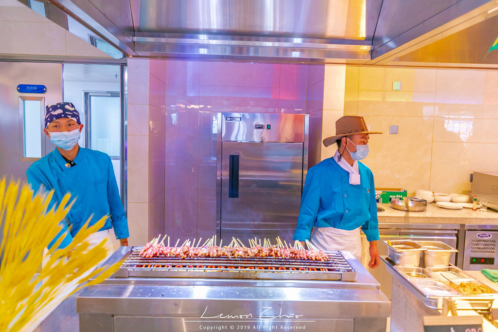 餐厅中人气最高的就是烧烤和铁板烧了,尤其是铁板烧,无论什么时候都排着长长的队伍,厨师用明火燃起熊熊的火焰,将整个铁板都点燃了,火焰卷夹着烤肉的呲啦呲啦的声响,真让人垂涎欲滴啊。烤牛排、烤羊排、烤虾都是我的最爱,鲜嫩多汁,真的是欲罢不能。