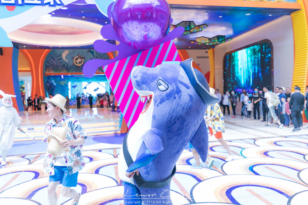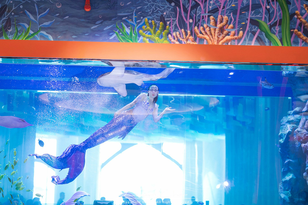 酒店的四个吉祥物也是纷纷惊艳亮相,跟孩子们互动合影,整个大厅也都成为了欢乐的海洋。突然,大家的目光都被水族吧所吸引了。原来这里面来了两条美人鱼,正在里面跟鱼群嬉戏玩耍,也是正在欢迎我们这些远道而来的朋友。