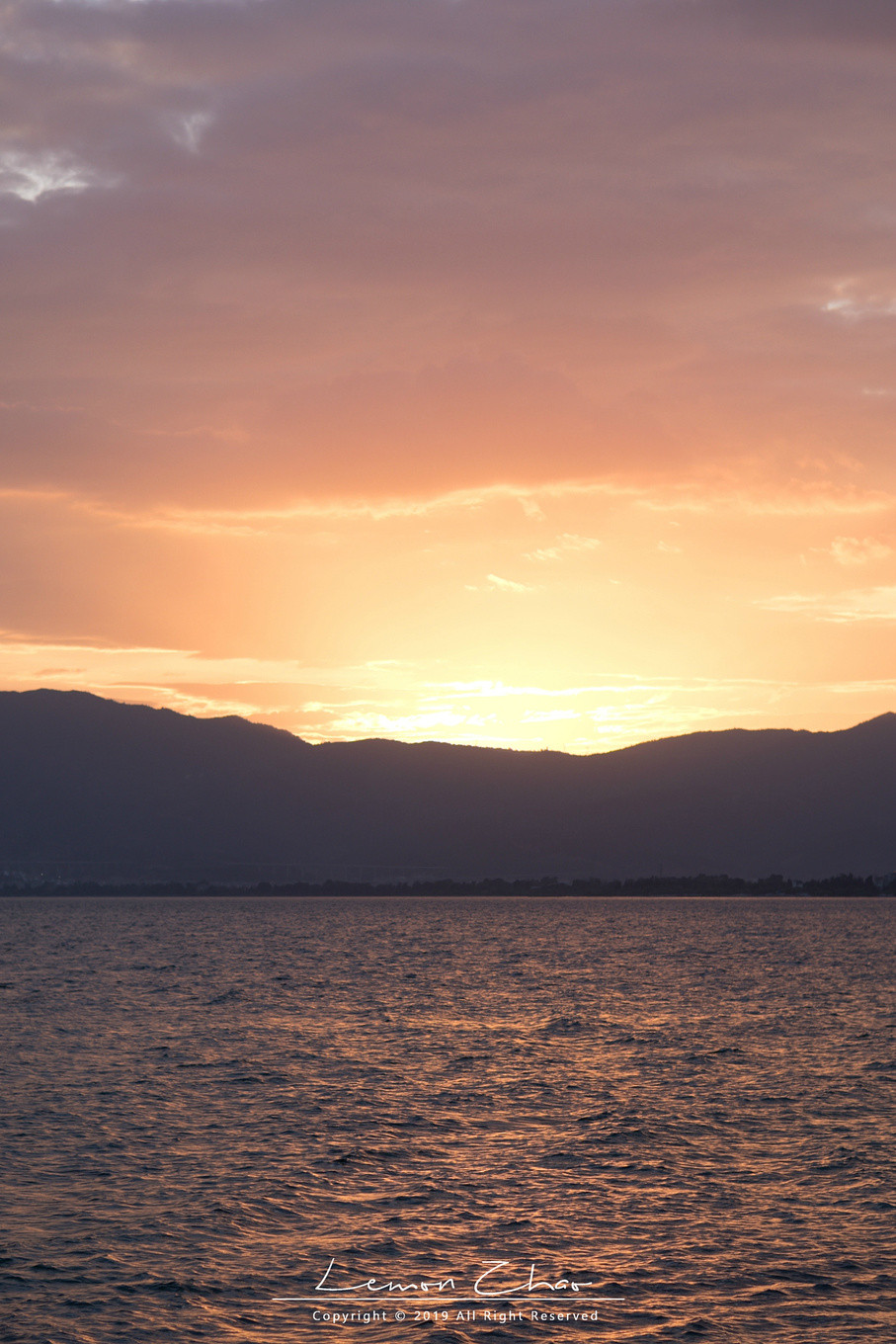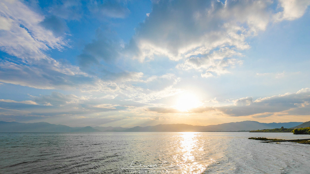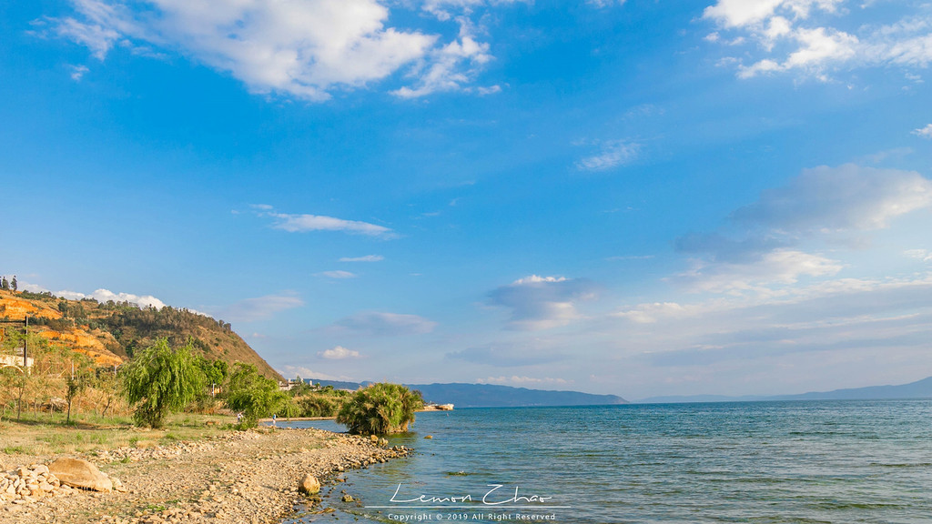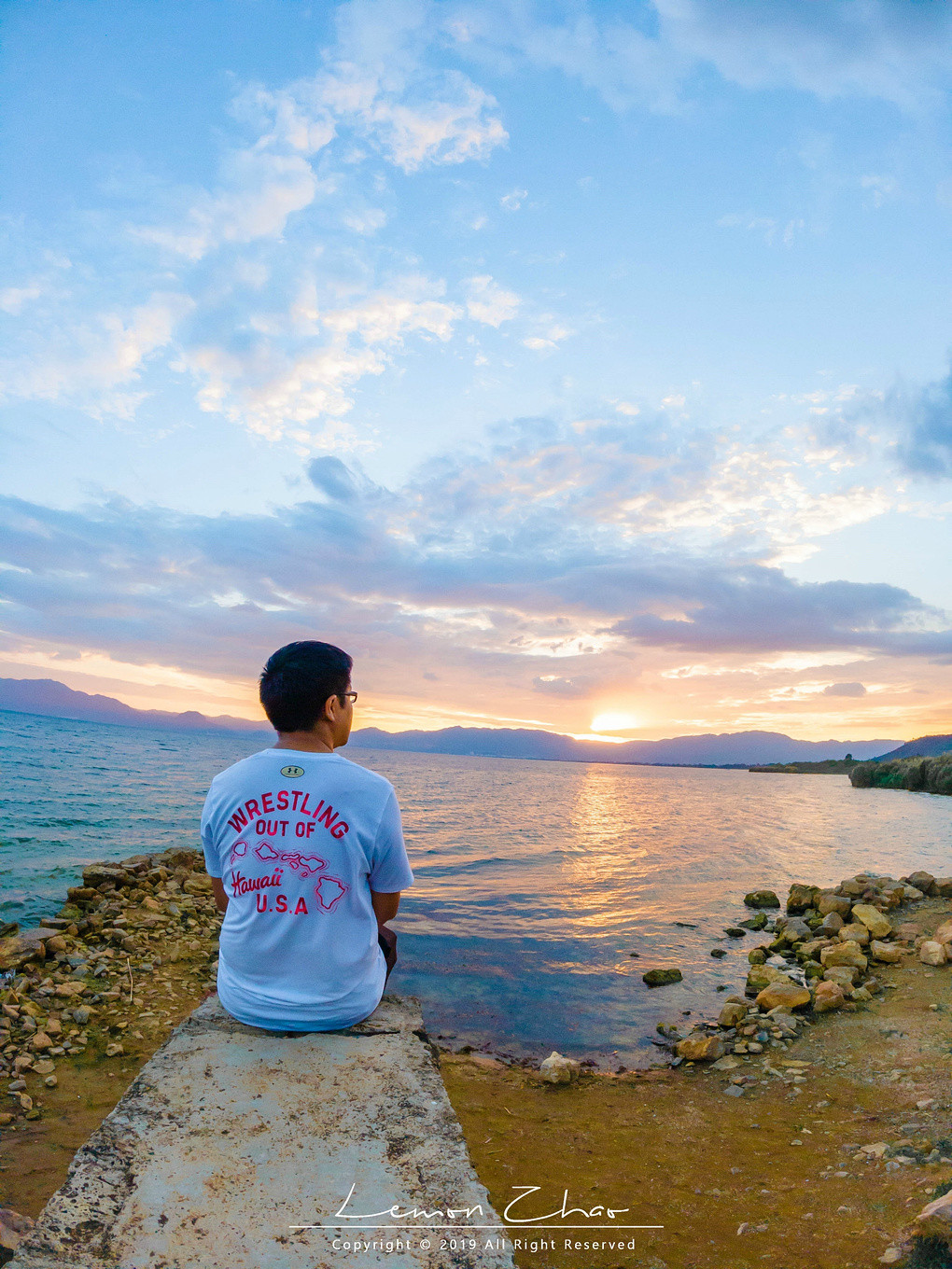 云南这边的日落时间会比较晚,一般要到晚上八点左右,我们到的时候差不多刚刚好。趁着天色还不是太晚,日晒也不是很强烈,在湖边拍一些带有蓝天白云的照片就可以安安静静地等待落日了。这次,我终于知道什么是让人感动的落日了。