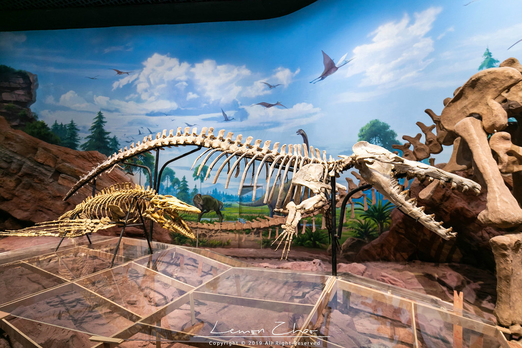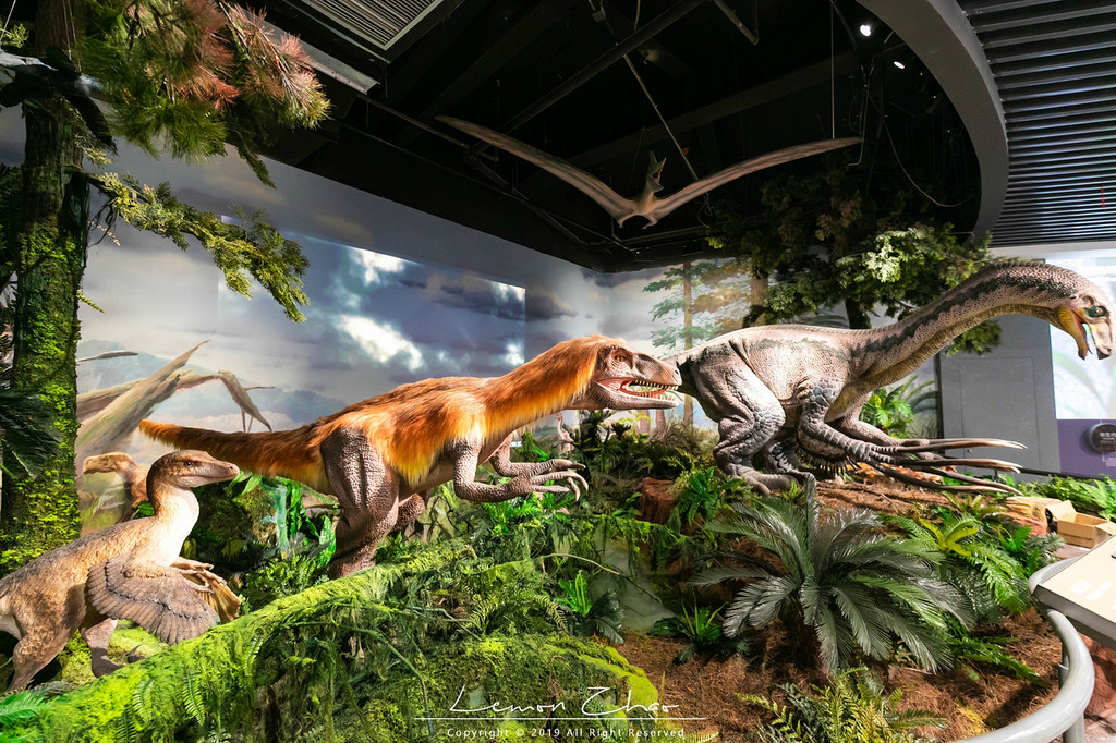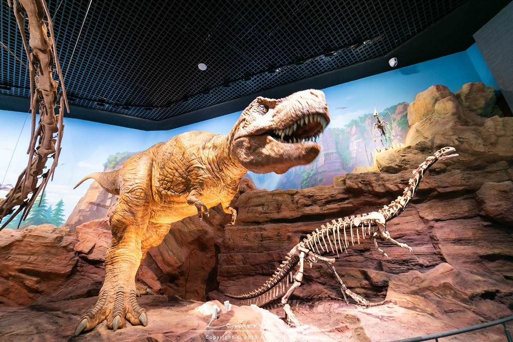 穿过一个时空隧道之门就开始了整个博物馆的游览。一走进去就能够听到恐龙的吼声,定睛一看原来里面藏着一只巨大无比的霸王龙,造型十分逼真,而且还不是晃动着脑袋可以跟人进行互动。周围还有各种恐龙的化石和标本,自己也仿佛一下子穿越到了那个时代,穿梭在恐龙的脚底下,也是一种别样的体验吧。