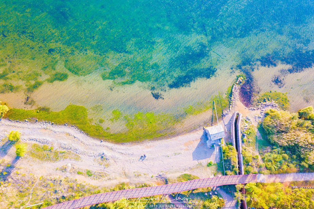 在离樱花谷不远处的一个路口,可以直接下到湖边,来这儿的人不算多,也正好可以拍出一些干净的画面。第一次这么近距离地站在抚仙湖边,头顶是云海翻腾,身沐温煦和风,睹一湖清泉,眸映岸边姹紫嫣红,心灵自然神韵,该用怎样美的词语去形容现在的感受呢?可能任何优美的词汇在抚仙湖的面前都会变得黯然失色吧。