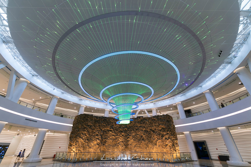 一进入馆内就被大厅震撼的设计所折服。馆内正中是一整块出土的化石墙,上面藏着诸多寒武纪时期动植物的化石,也是馆内体积最大的化石遗留。穹顶之上是一个沿着时间轨道不断延伸的螺旋体,讲解员告诉我们这是根据生物进化所创作出来的作品,意味生物的进化是越来越高级,越来越顶尖的。