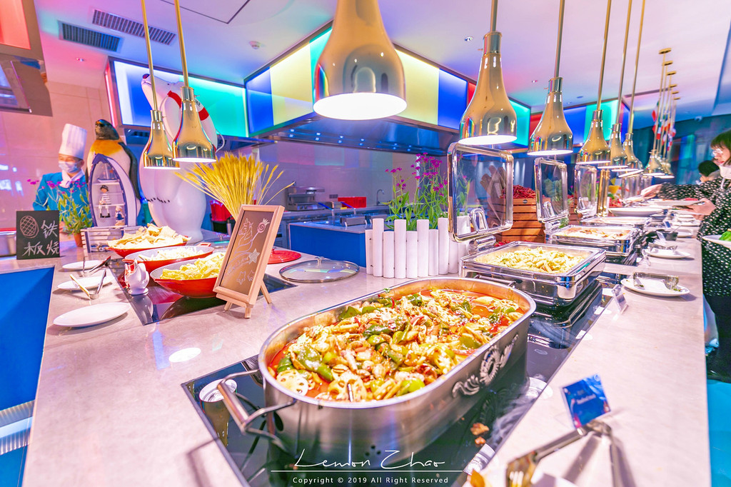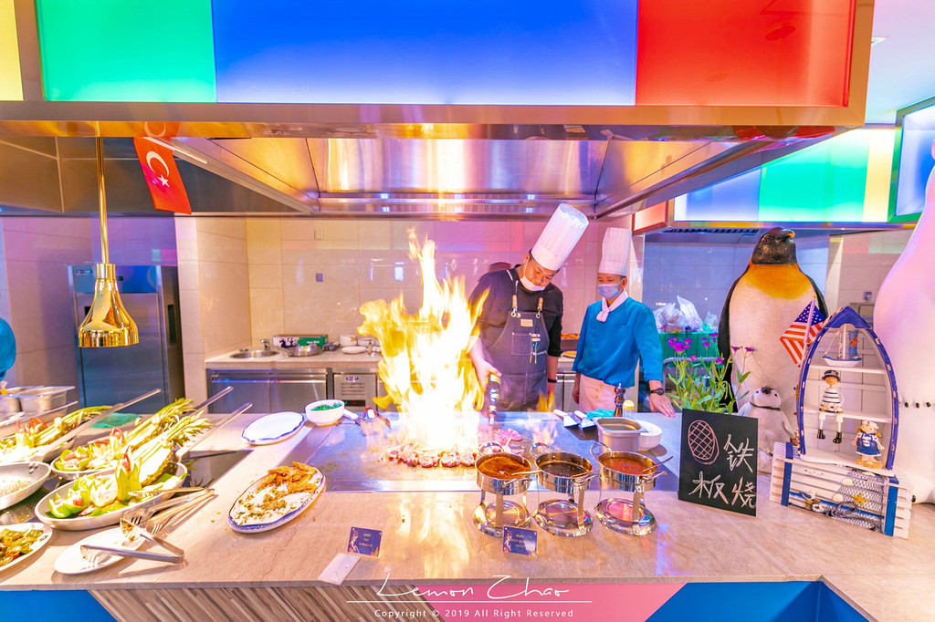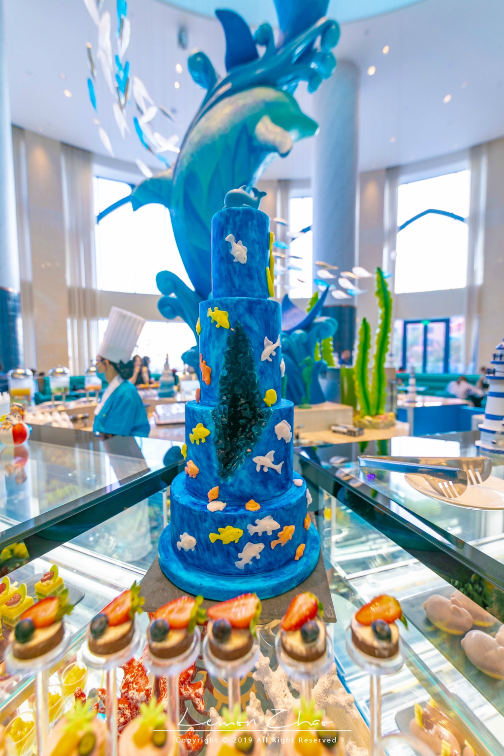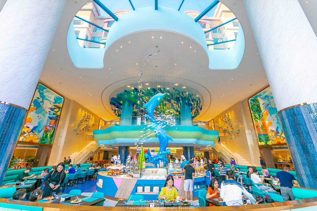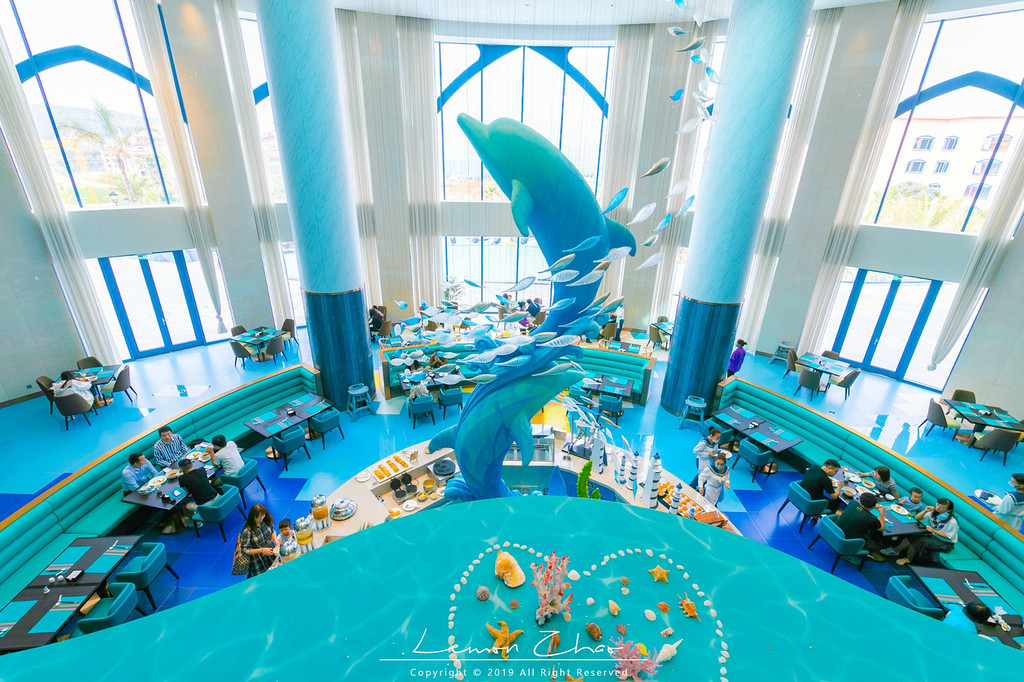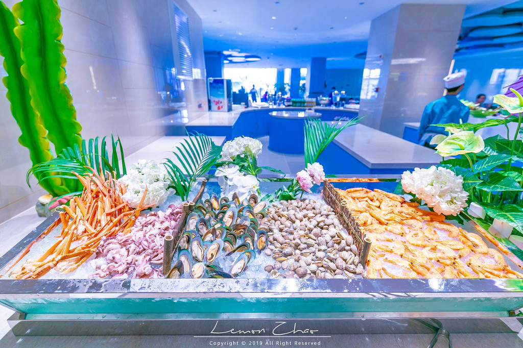 因为中午赶飞机,所以也并没有吃午饭,肚子都已经咕咕叫了,正好酒店的晚餐时间也开始了。我们这几天吃饭都是在酒店3楼的水晶全日餐厅用餐,服务员也都是非常童趣地穿上了水手服,到处弥漫着海洋气息,一场关于美食的饕餮盛宴就此开始。