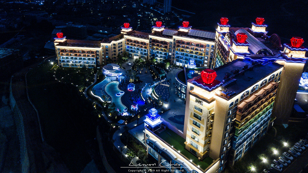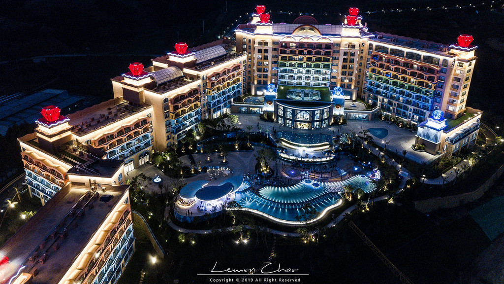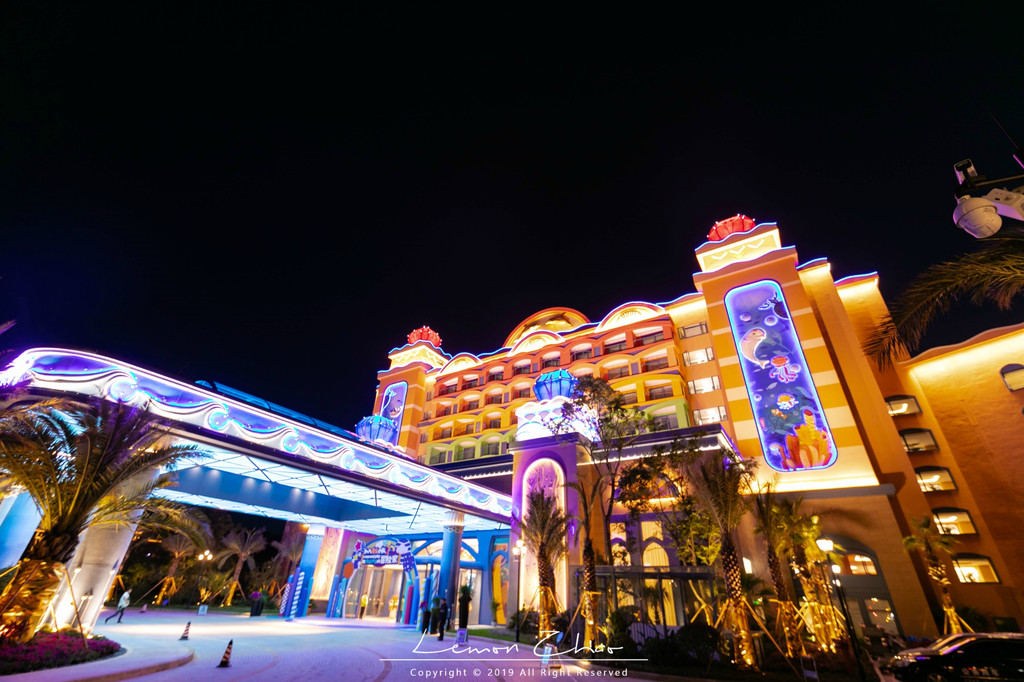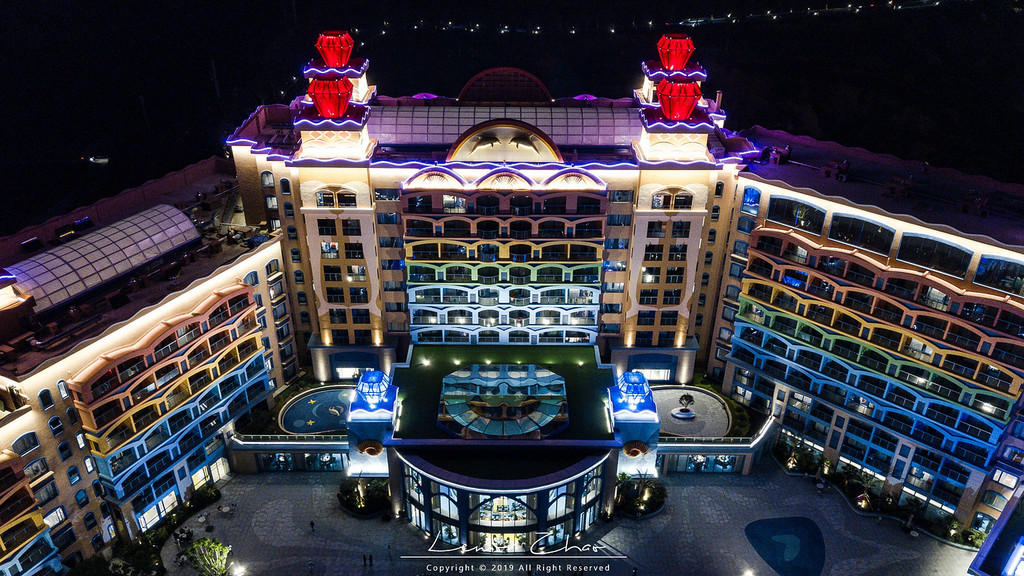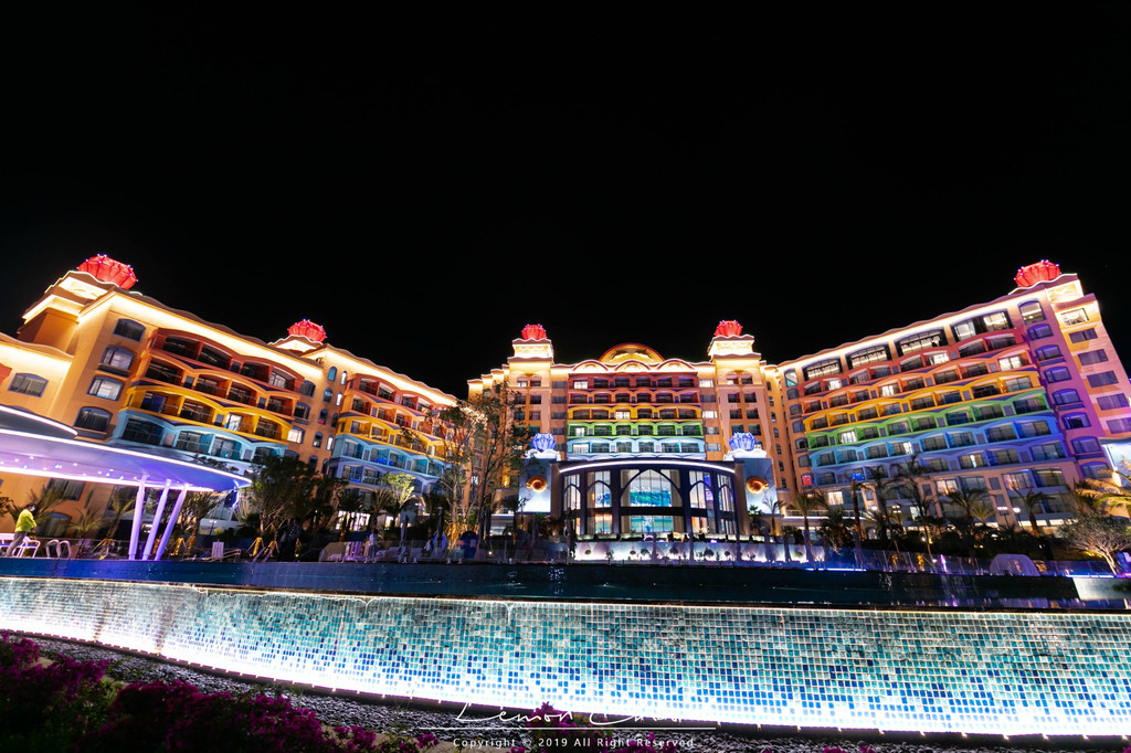 吃过晚餐准备出来看看酒店的夜景。在灯火阑珊中的海豚湾酒店,就好像是遗世而独立的水晶城堡,璀璨夺目,掩映在湖光山色之中,分外妖娆。
