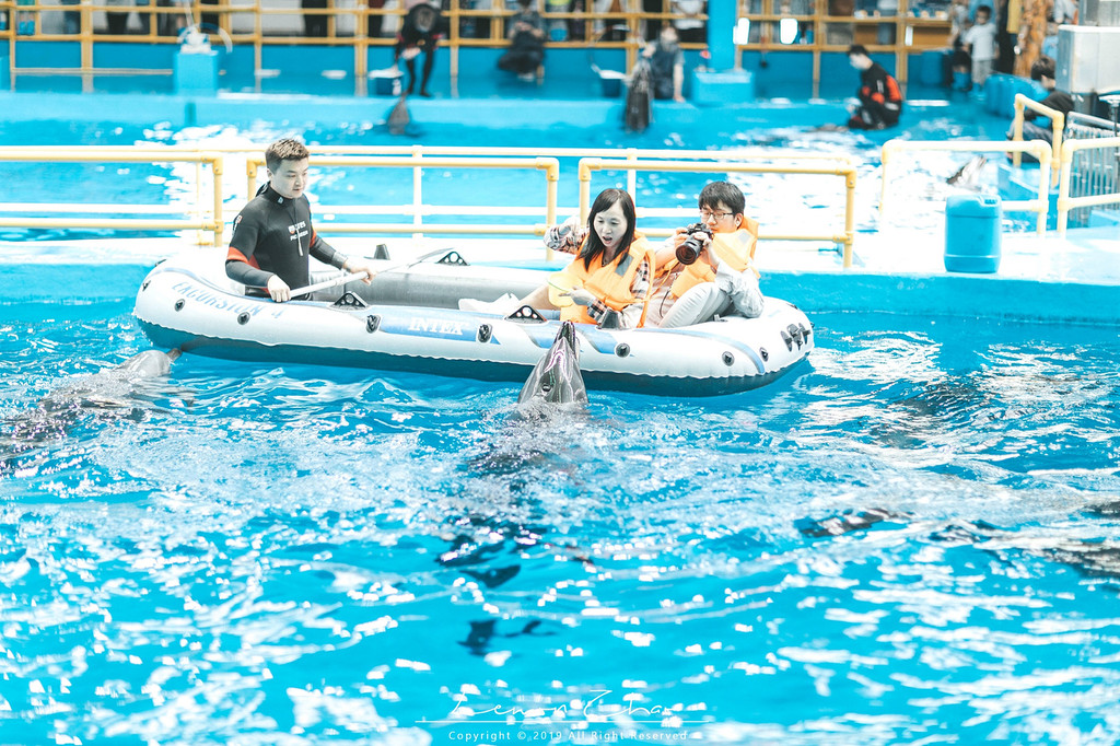 两个大人一艘船,上船之前需要穿好救生衣,手上也需要消毒干净,如果手上戴着首饰什么的最好取下来,避免掉进水池造成海豚误食。