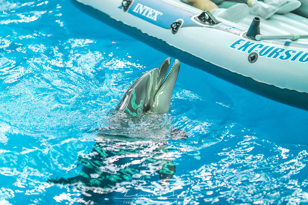 海豚真的是一种神奇的物种,它们真的太会玩了。我们进入水池之后根本不用自己划船,基本都是海豚推着我们在前行,非常有趣。而且真的第一次触摸到了海豚,那种不可名状的触感真让人爱不释手,没有鱼鳞的层次感,十分光滑。如果海豚高兴的话,说不定还能送你一个大香吻哦,这可是来自大海的味道呀。