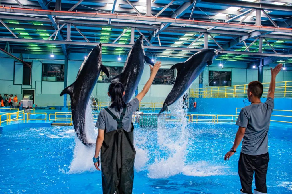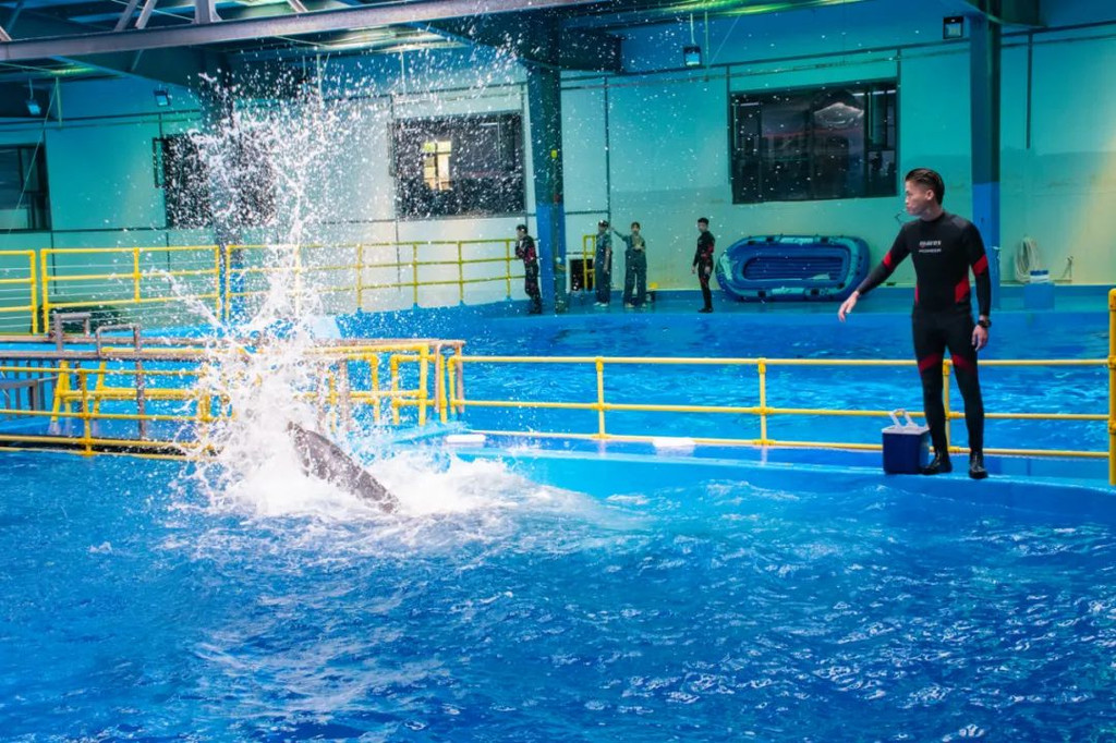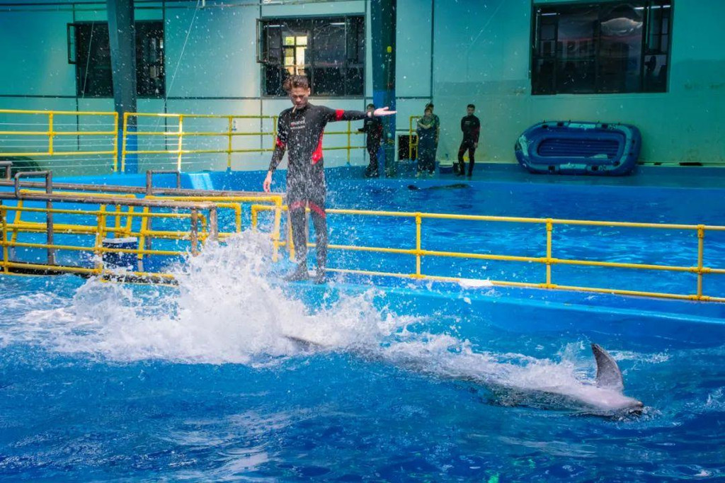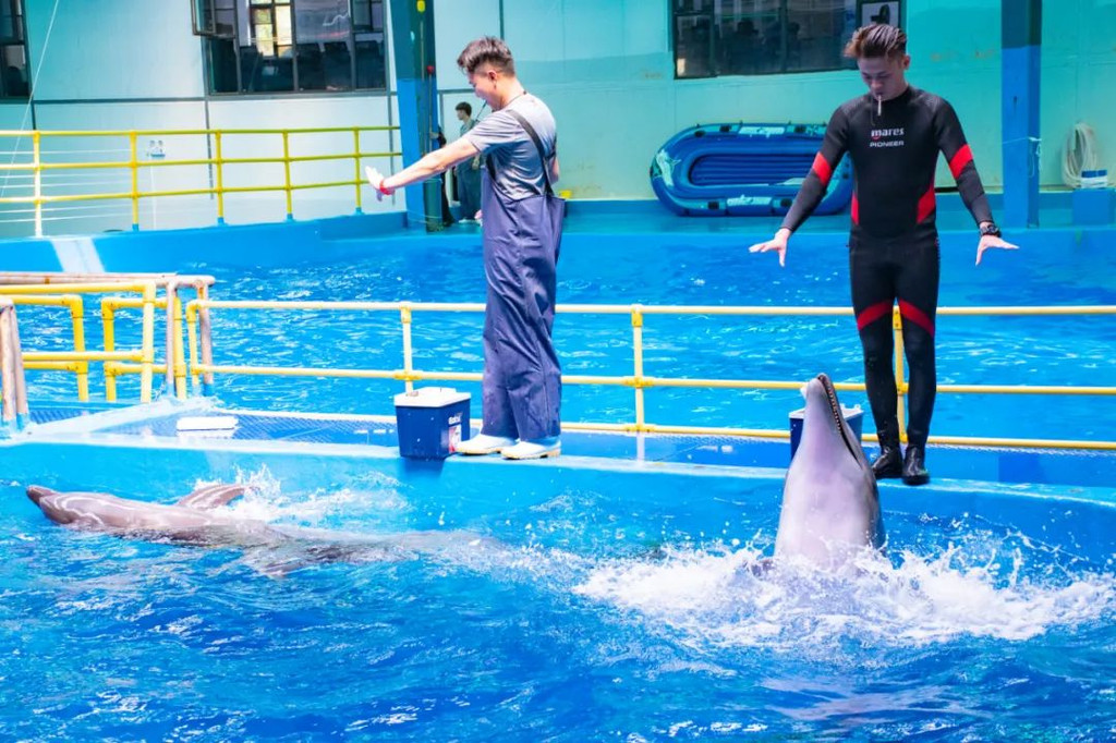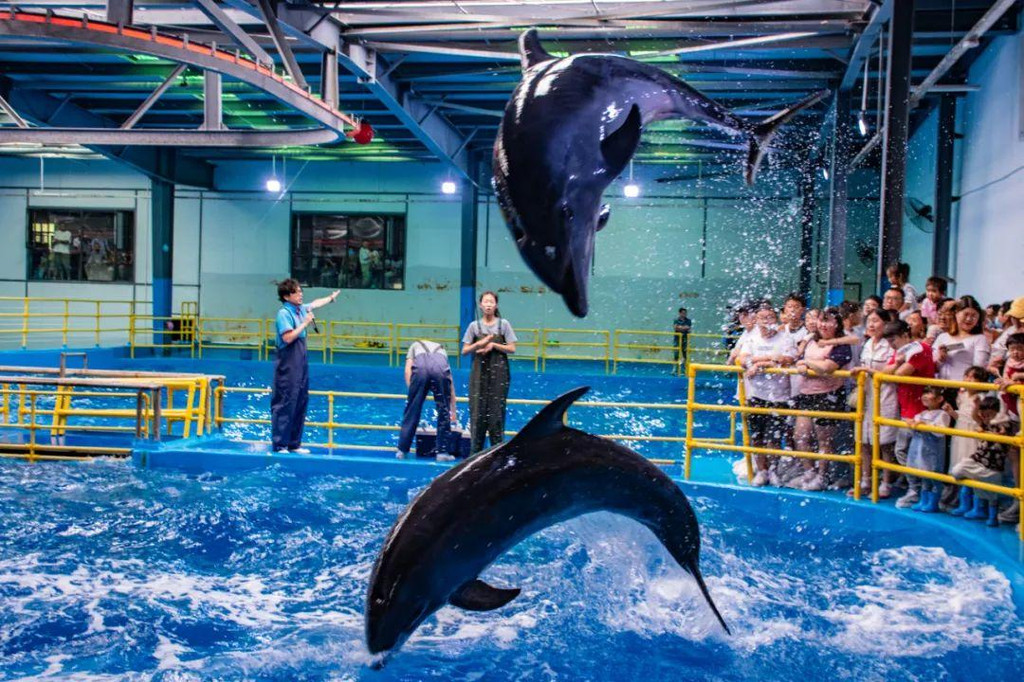 有的海豚欢快地在跳跃,溅起一池水花,有的海豚整齐划一的摆出高难度的动作,有的自由地在水中环游。