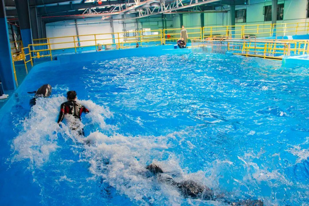 从外面看似乎毫不起眼,只是一座以“蓝色”为主要色调的两层小楼,可是当你换装、消毒,顺着引导走上二楼——海豚亲密接触区时,你才发现这里别有洞天。