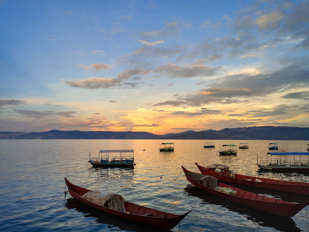 夜色渐浓,夕阳将湖面和天空晕染成浅黄、粉红色,搭配着湖上漂浮的红色小舟和蓝色游船,让人误以为走入博物馆安静地欣赏油画。