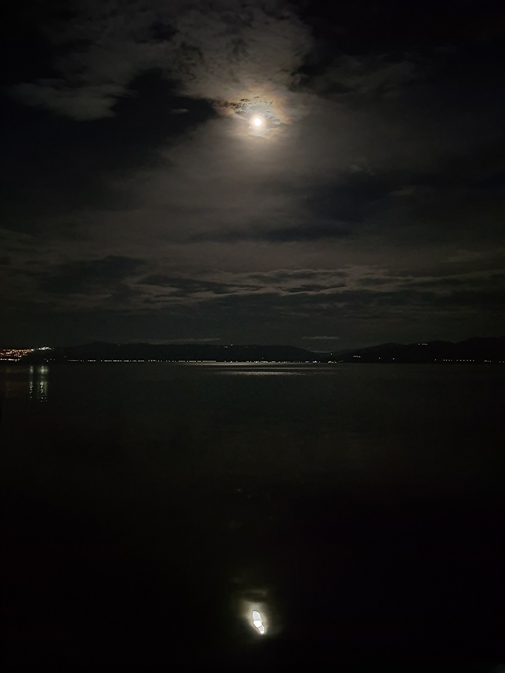 漆黑的天空里闪烁着几颗星星,这是我一直期待见到的景象,没有过多人工灯光的污染,只有黑色的天和闪亮的星。月亮一直躲到十点多才爬到湖面上空,在云彩的包围下泛着彩色的光晕,映在湖水里的倒影随着波浪不停地晃动,不管怎么拍都拍不到完整的月影。晚上气温下降,吹着湖风甚至冷得让人发抖。夜里外面的人声逐渐消失,只能听到湖水拍打房屋的声音,哗啦哗啦,像是睡眠曲一样,这个时候再听李健的《抚仙湖》更能感受这里的美好。