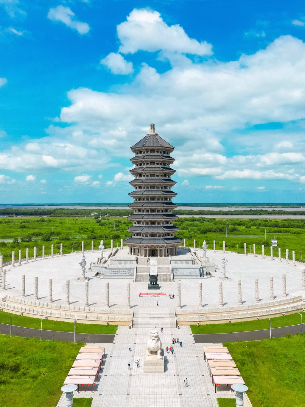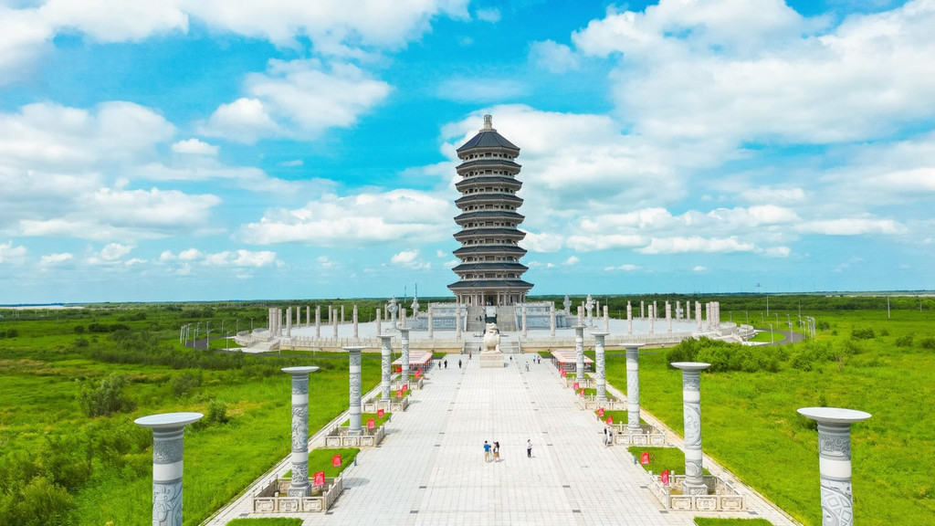 东极宝塔位于黑瞎子岛的东部极角,是一座仿汉唐风格的九层宝塔,象征九九归一。广场上耸立着56根青石盘龙浮雕柱,代表56个民族同心协力,共同守卫祖国的神圣领土。